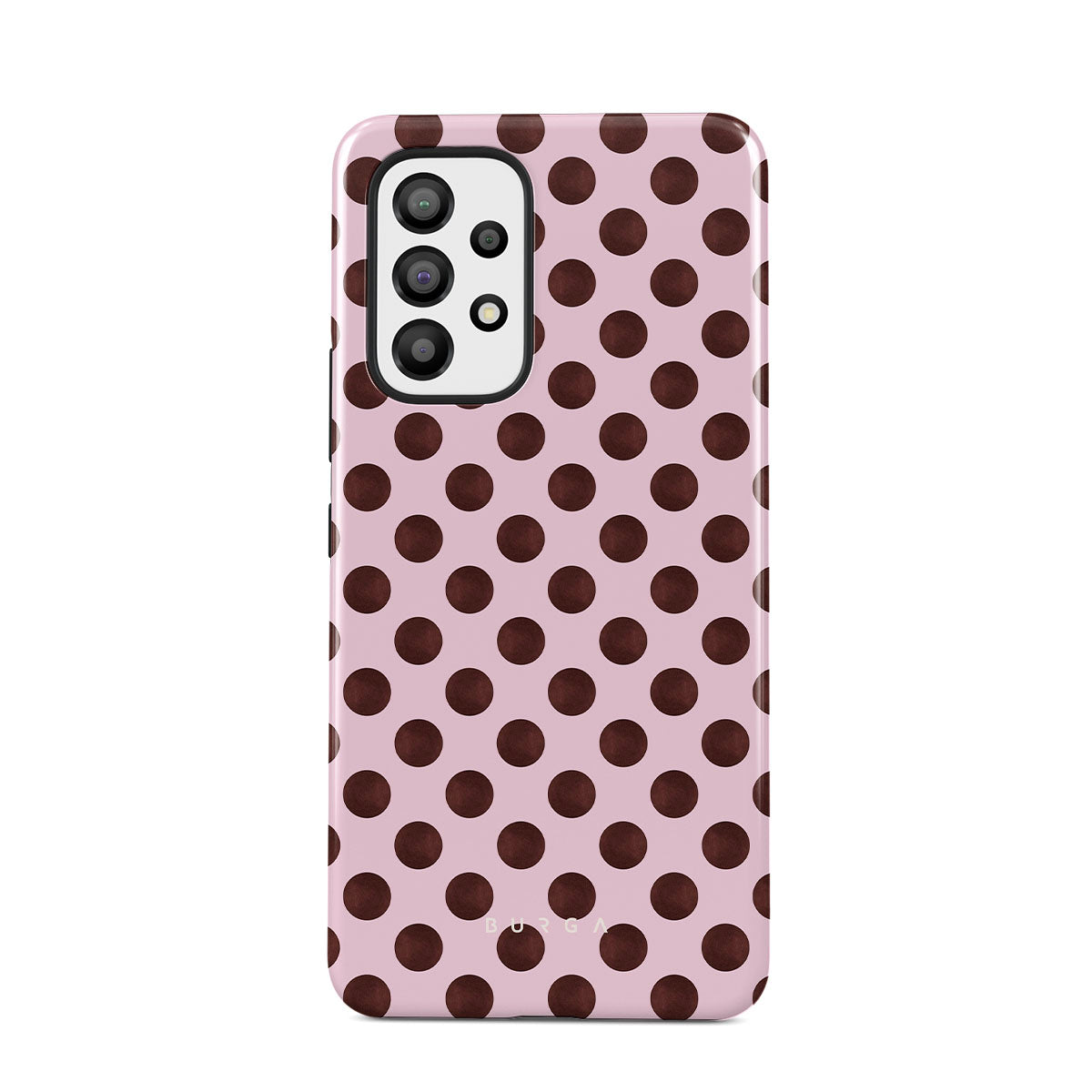This design features: a retro polka dot pattern, pink background with brown polka dots.