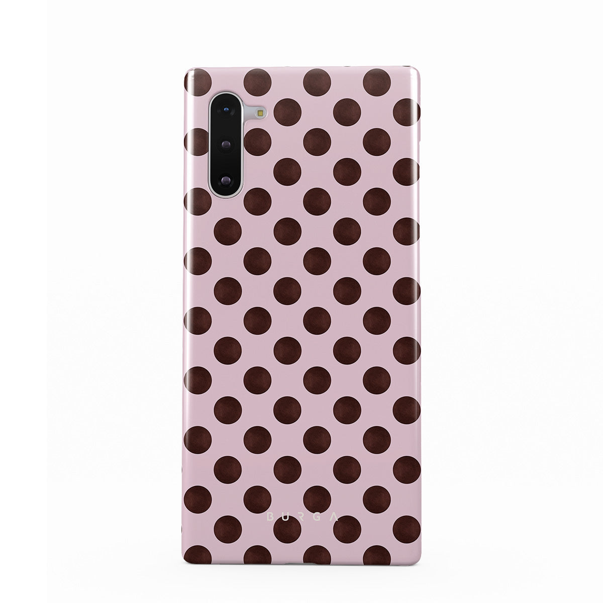 This design features: a retro polka dot pattern, pink background with brown polka dots.