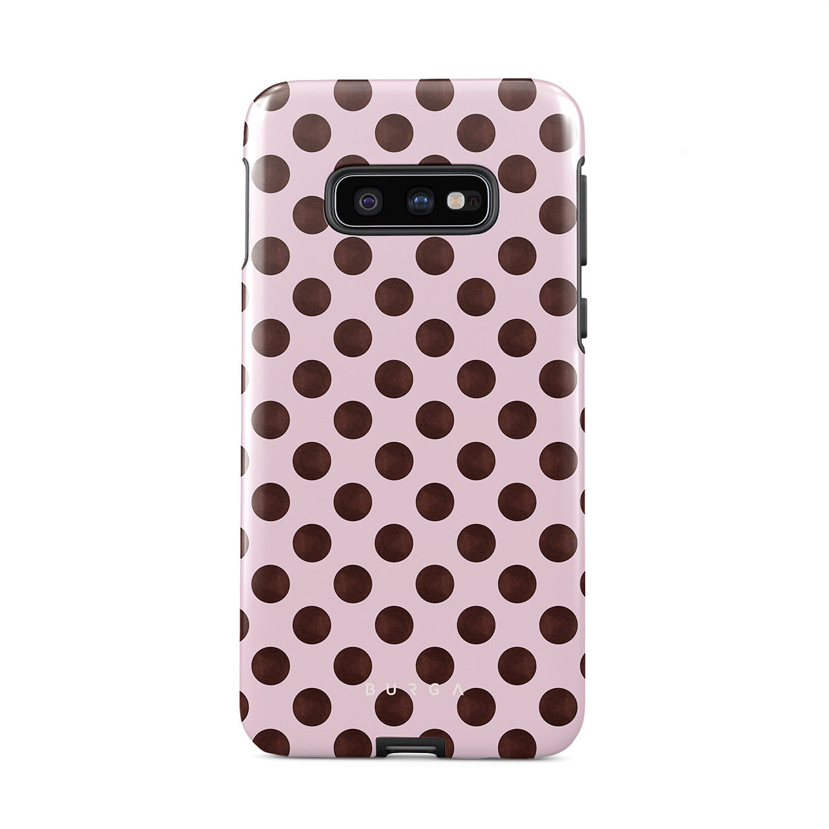This design features: a retro polka dot pattern, pink background with brown polka dots.