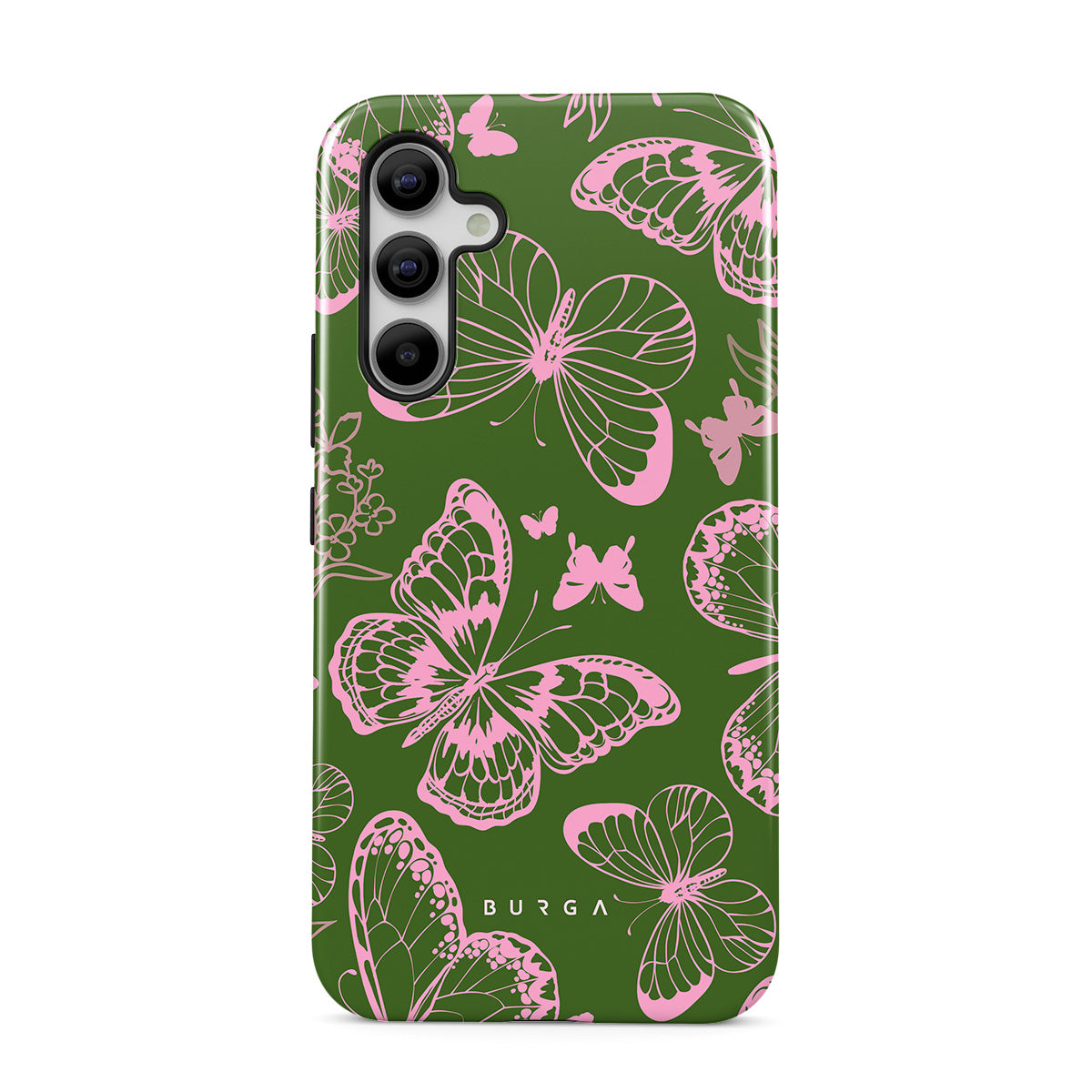 A retro-inspired masterpiece, this Samsung Galaxy A55 phone case features a delightful butterfly print that's sure to take you on a trip down memory lane. Inspired by the carefree spirit of the groovy era, this case reminds you to live your best life with No Regrets and embrace every moment. With this enchanting case design, you'll be ready to spread your wings and fly high, with nothing holding you back.