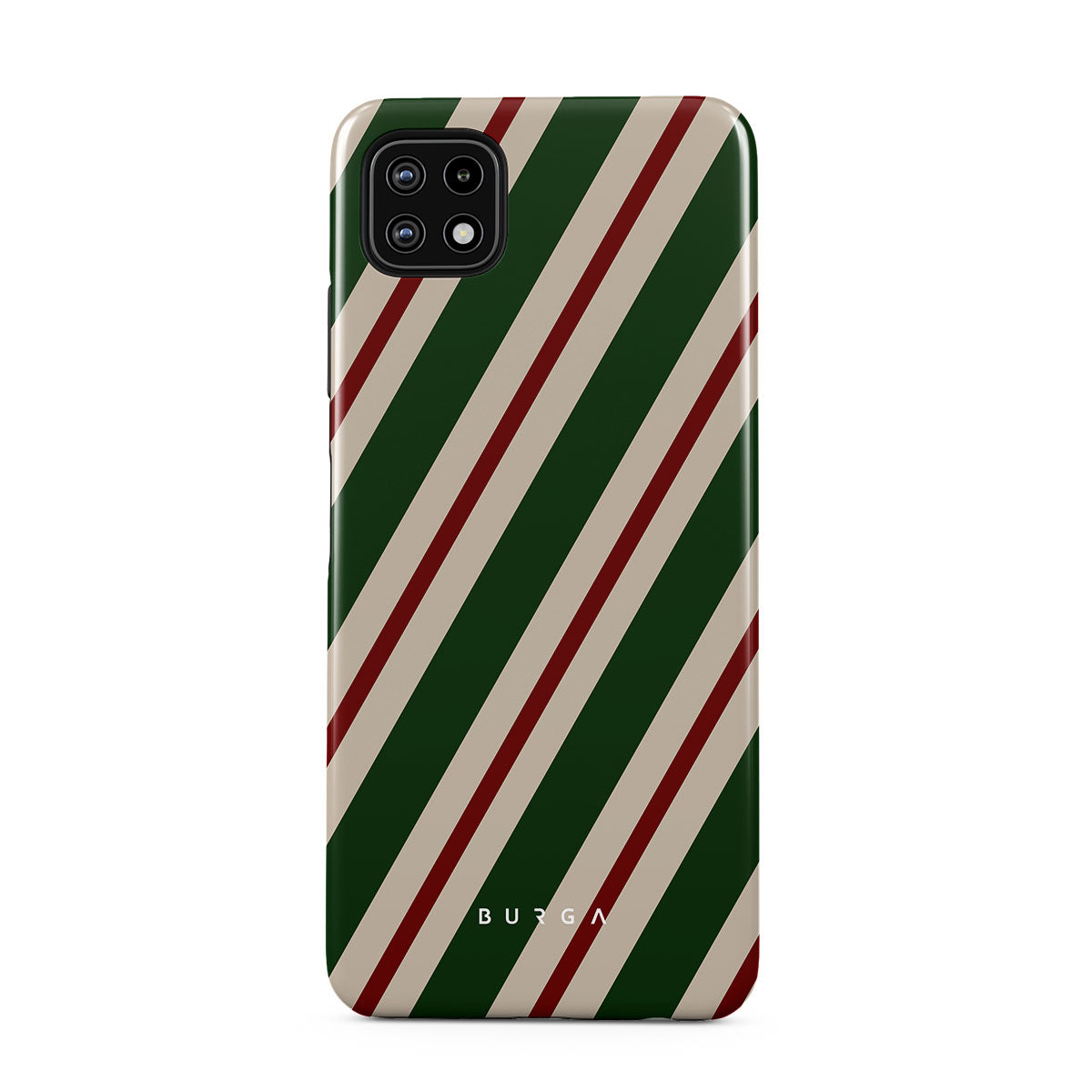 A joyful design that screams holiday spirit. Our North Pole Samsung Galaxy A22 5G Case phone case transports you straight to Santa's workshop. Bold green, red, and white stripes echo the joy and laughter of elves preparing for the festive season.