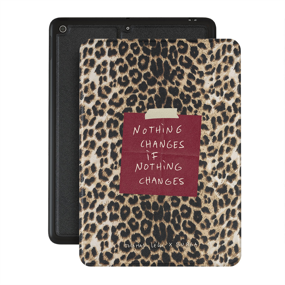 This design features: cursive text, quote, red post-it note, animal print
