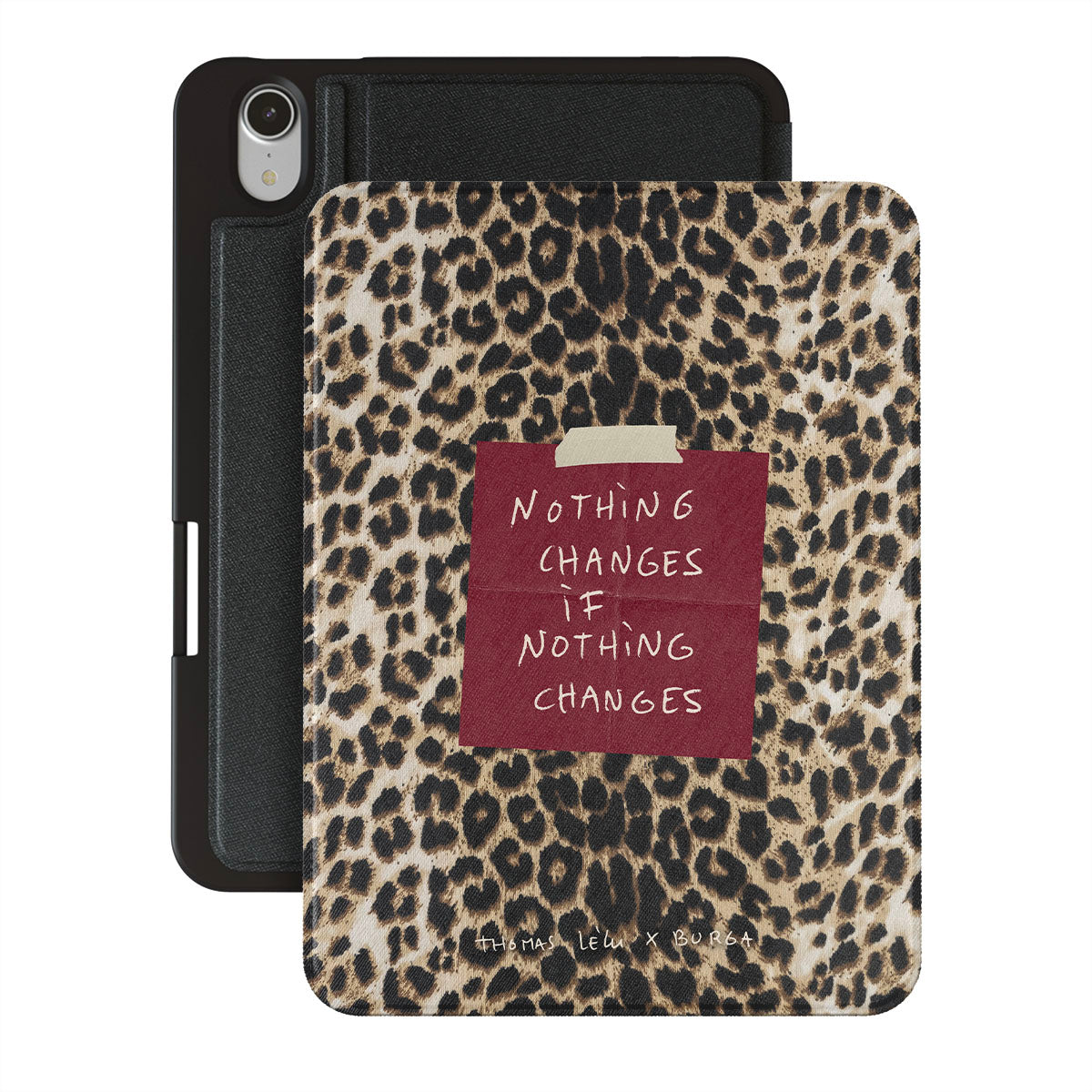 This design features: cursive text, quote, red post-it note, animal print