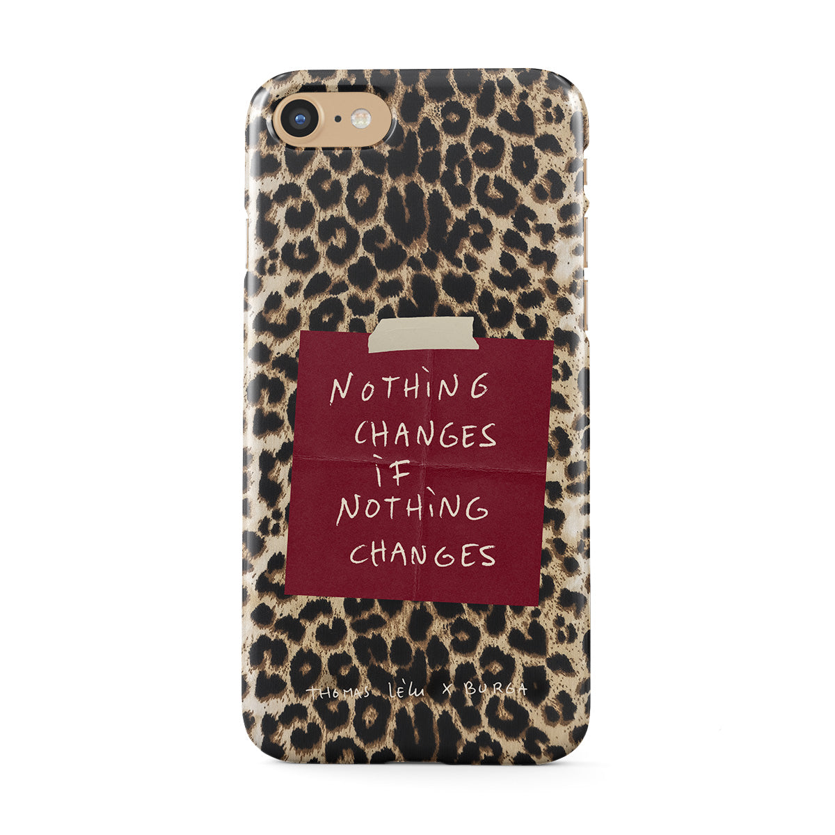 This design features: cursive text, quote, red post-it note, animal print