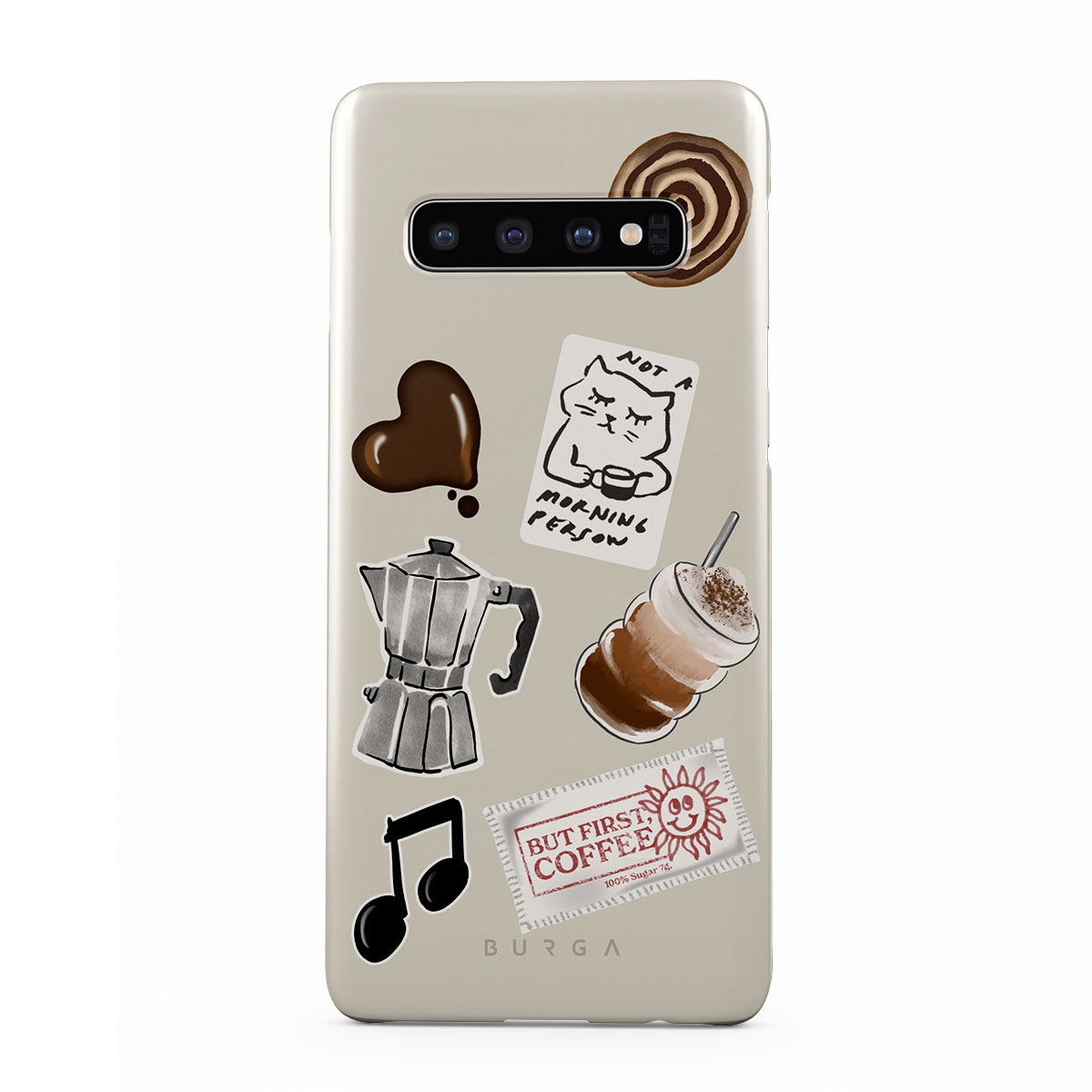 This design features: moka pot, frappe, cinnamon roll, chocolate heart, "Not a morning person" sticker, "But First, Coffee" receipt, music note