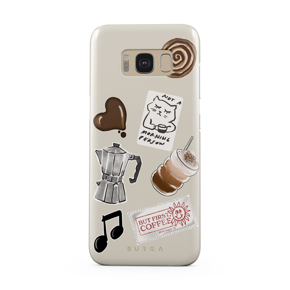 This design features: moka pot, frappe, cinnamon roll, chocolate heart, "Not a morning person" sticker, "But First, Coffee" receipt, music note