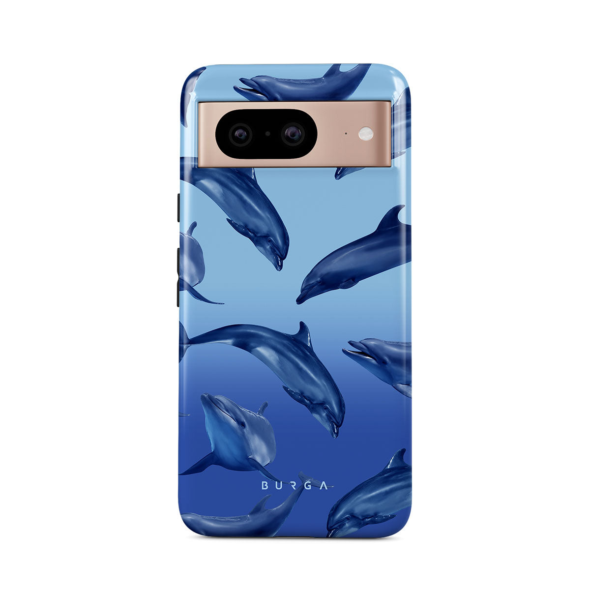 Our Ocean Cowboy Google Pixel 8 phone case features majestic dolphins soaring across a sapphire ocean, symbolizing the untamed beauty and mystery of the deep blue. It's a call to the wild, right in your hands.