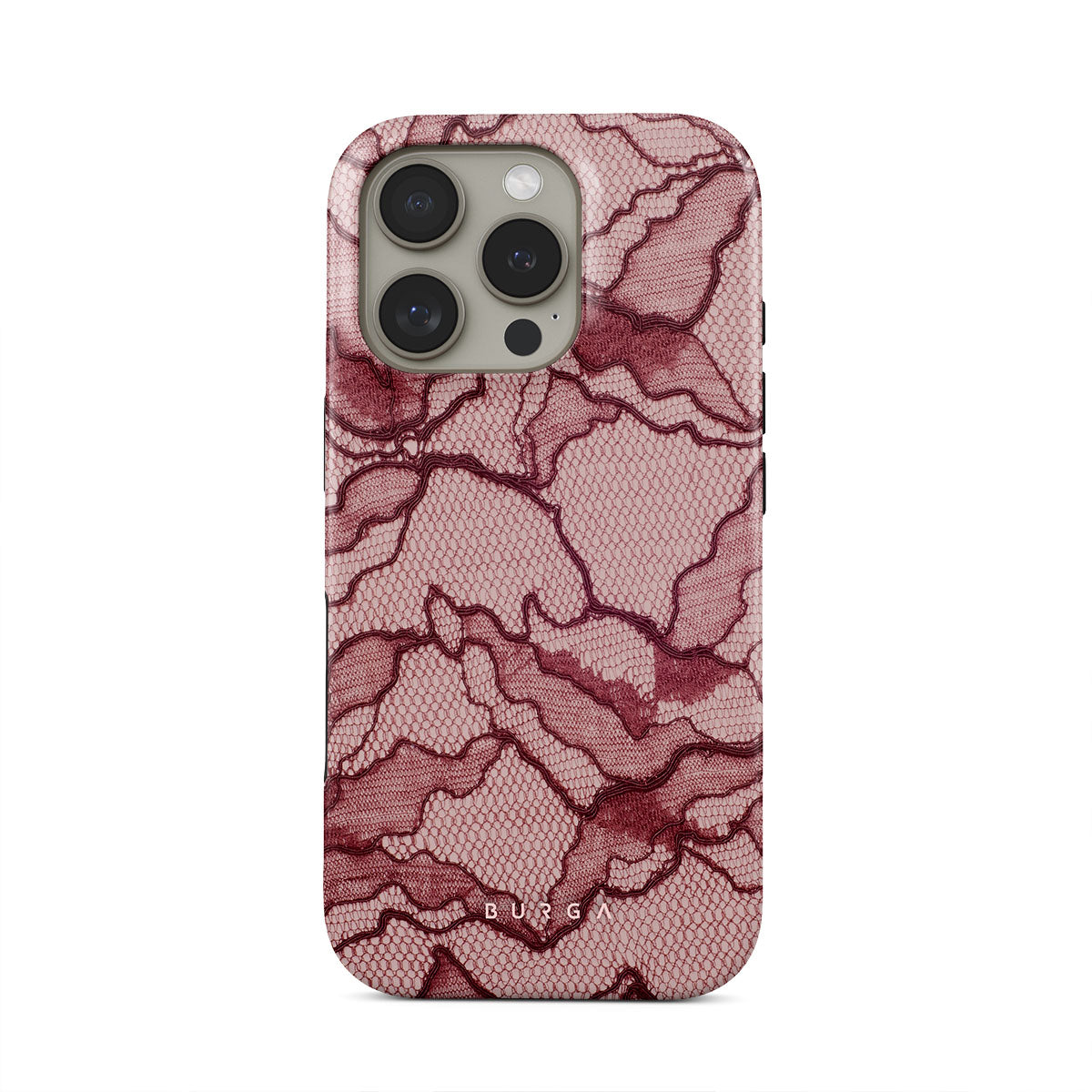 Channel your inner power with our Office Siren iPhone 16 Pro phone case design. A soft rosé backdrop and dark pink lace blend elegance and boldness, perfect for those who make quiet yet undeniable statements with confidence.