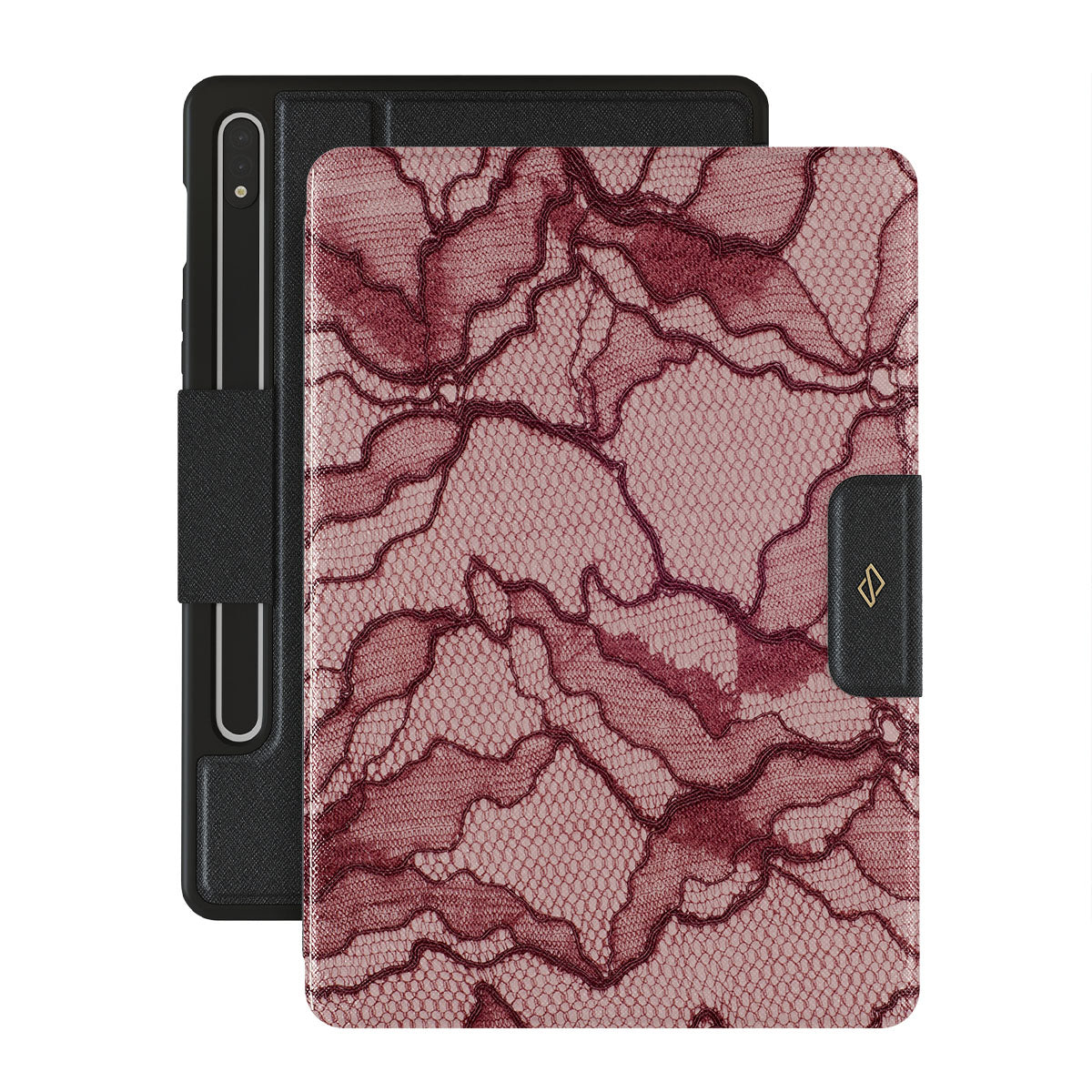 Channel your inner power with our Office Siren Samsung Galaxy Tab S9+ folio case design. A soft rosé backdrop and dark pink lace blend elegance and boldness, perfect for those who make quiet yet undeniable statements with confidence.