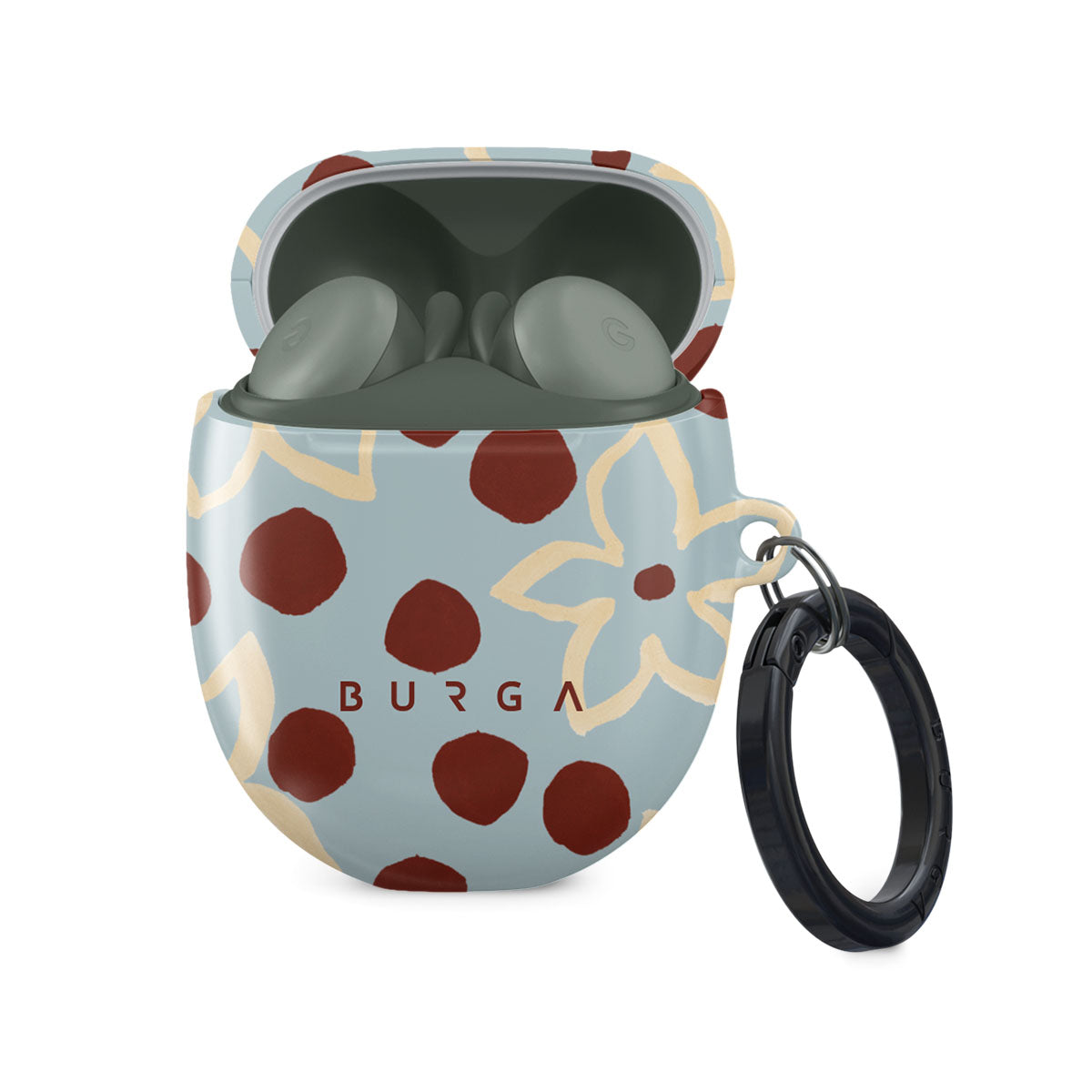 The Frutaria Google Pixel Buds A design: retro surf motel wallpaper meets vintage ceramics. The soft florals, earthy dots, and cool-toned palette give major “forgotten seaside town in the ‘70s” energy.