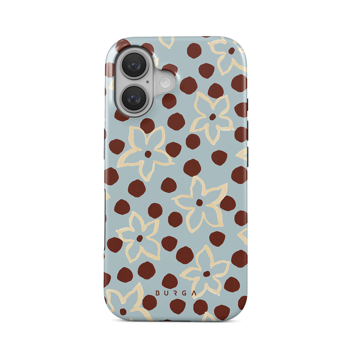 The Frutaria iPhone 16 Plus phone case design design: retro surf motel wallpaper meets vintage ceramics. The soft florals, earthy dots, and cool-toned palette give major “forgotten seaside town in the ‘70s” energy.