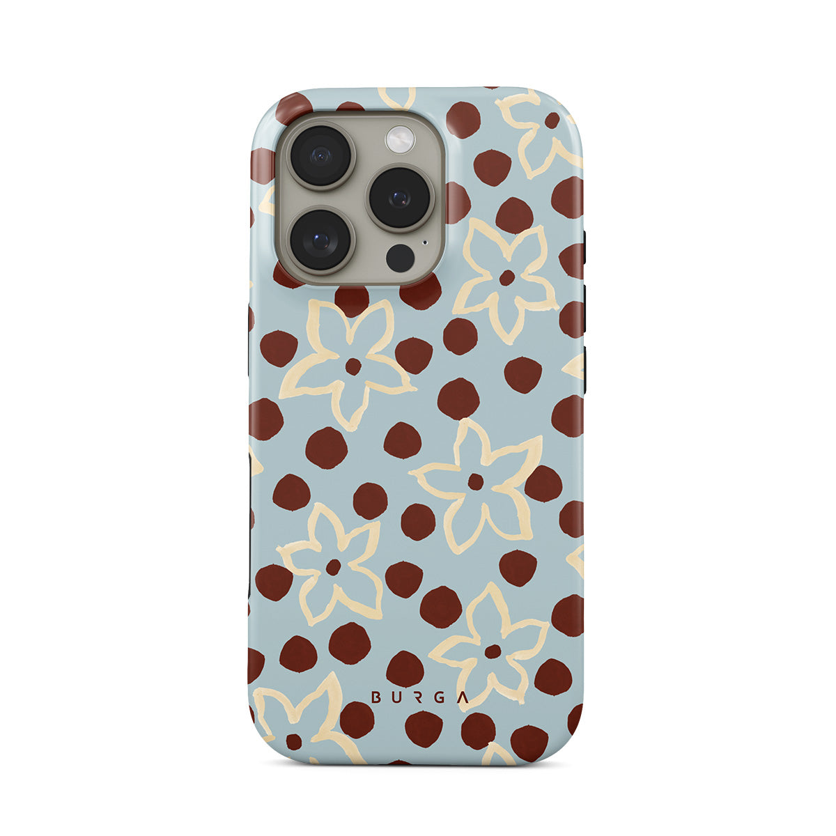 The Frutaria iPhone 16 Pro phone case design design: retro surf motel wallpaper meets vintage ceramics. The soft florals, earthy dots, and cool-toned palette give major “forgotten seaside town in the ‘70s” energy.
