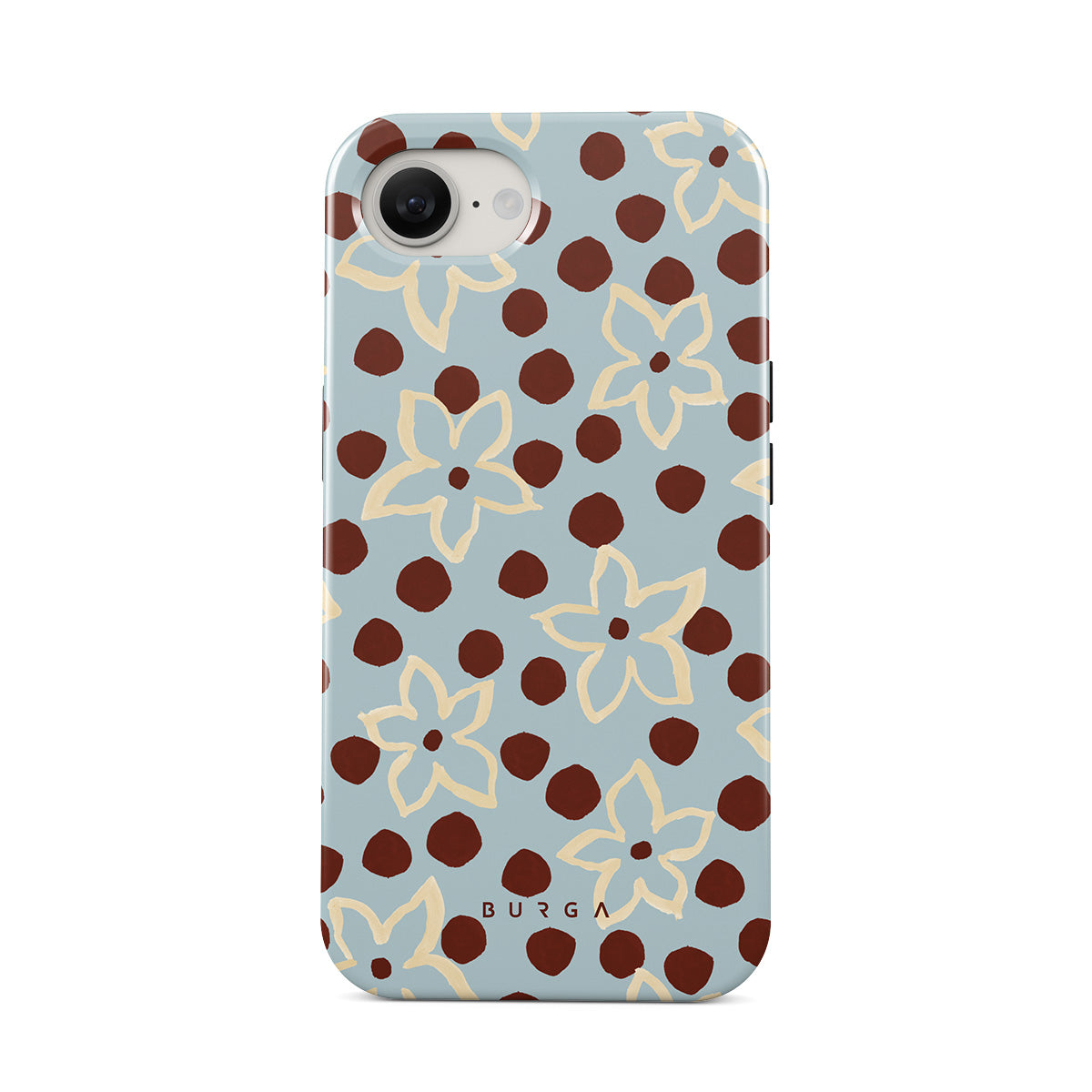 The Frutaria iPhone 16e phone case design design: retro surf motel wallpaper meets vintage ceramics. The soft florals, earthy dots, and cool-toned palette give major “forgotten seaside town in the ‘70s” energy.