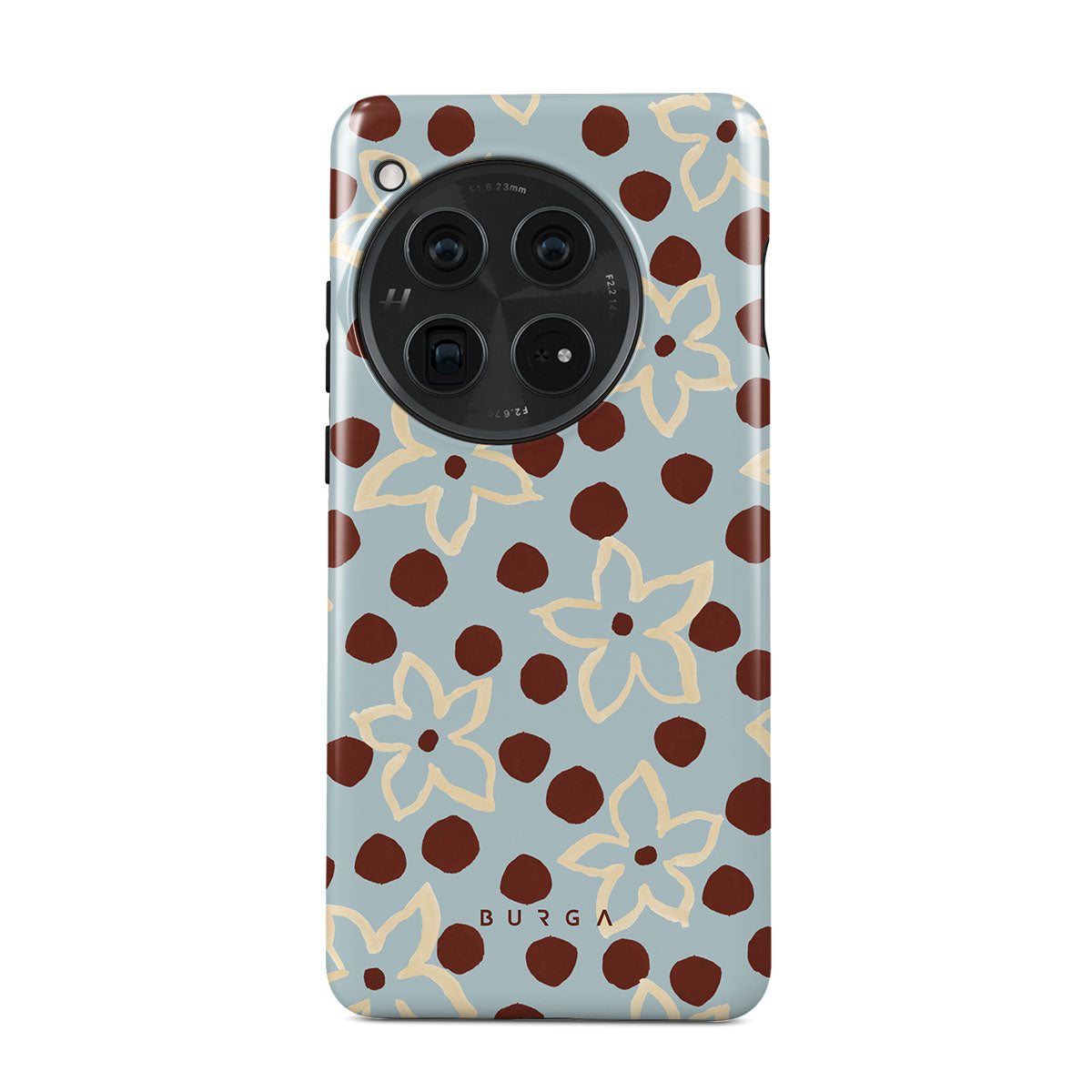 The Frutaria OnePlus 12 phone case design design: retro surf motel wallpaper meets vintage ceramics. The soft florals, earthy dots, and cool-toned palette give major “forgotten seaside town in the ‘70s” energy.