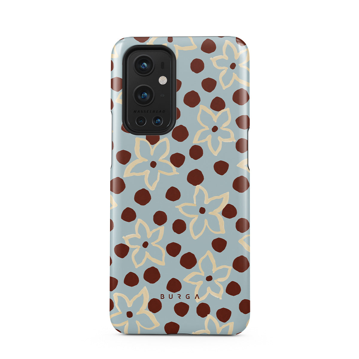 The Frutaria OnePlus 9 Pro phone case design design: retro surf motel wallpaper meets vintage ceramics. The soft florals, earthy dots, and cool-toned palette give major “forgotten seaside town in the ‘70s” energy.