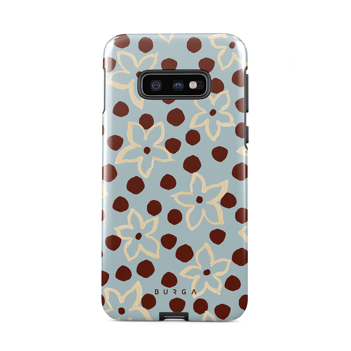 The Frutaria Samsung Galaxy S10E phone case design design: retro surf motel wallpaper meets vintage ceramics. The soft florals, earthy dots, and cool-toned palette give major “forgotten seaside town in the ‘70s” energy.