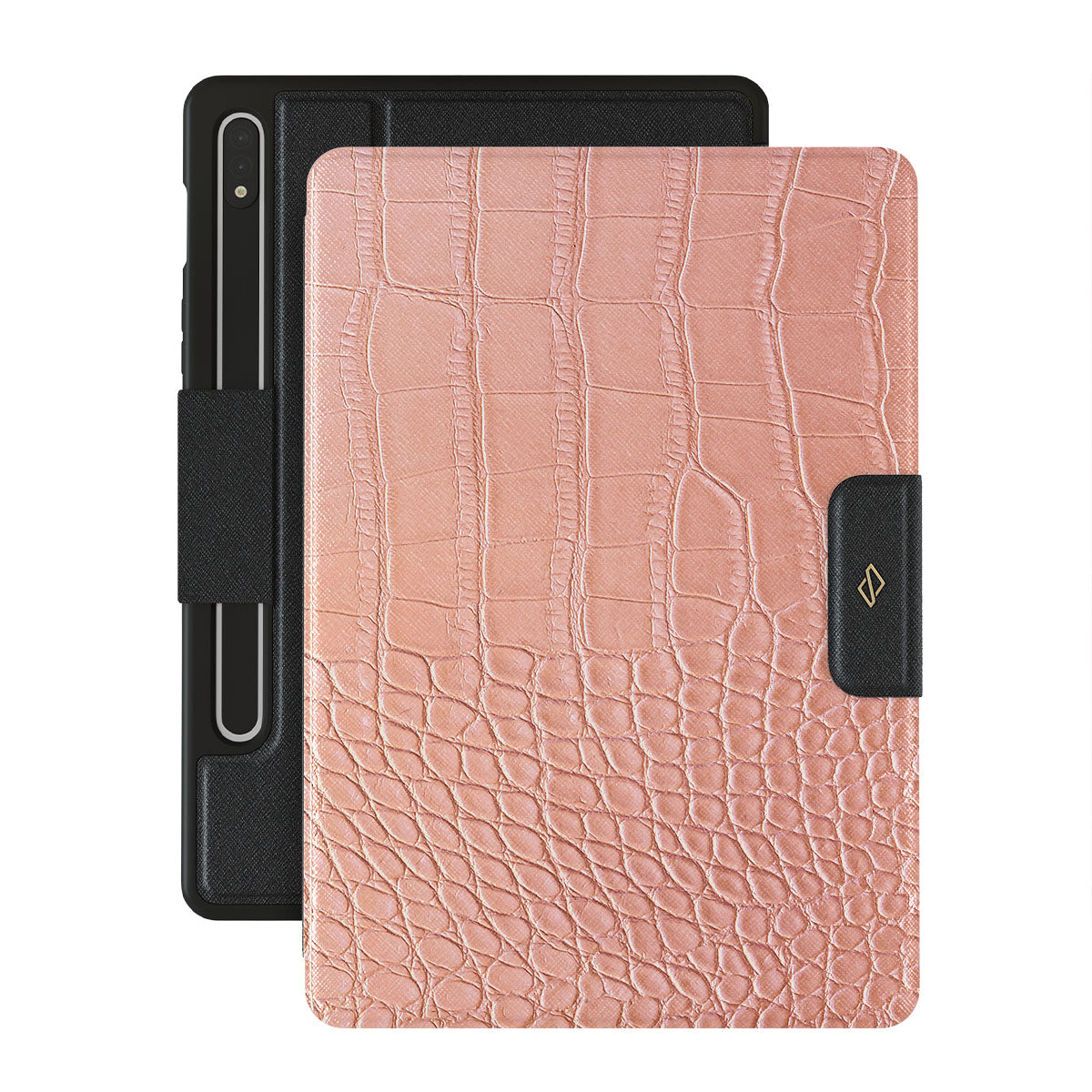 Our Pink Croco-it is a printed pattern * Samsung Galaxy Tab S8/S7 folio case features a classic crocodile design reimagined and showcased in a soft coral shade. The new take on the dangerous animal print will add a touch of softness to your style while simultaneously offering heavy-duty protection to your device.