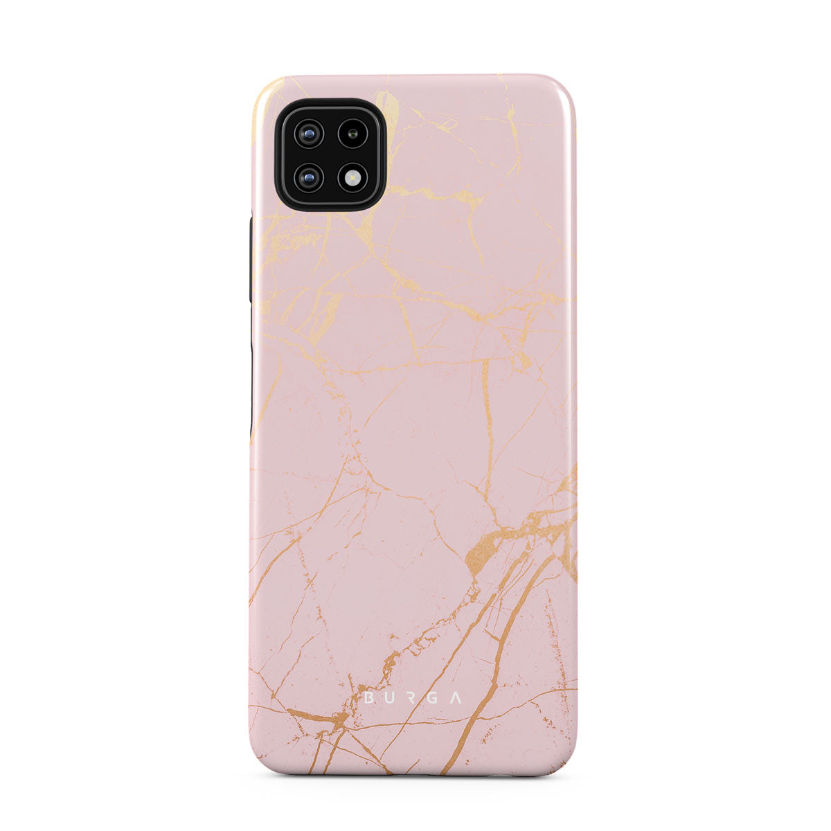 Growing under the beautiful sky and warmed by the rays of the sunshine, when ripped, peach offers you sweetness and softness. This is why our Peachy Gold Samsung Galaxy A22 5G phone case design adds a bit of golden color to the pink marble dream making a protective phone case both pretty and durable.