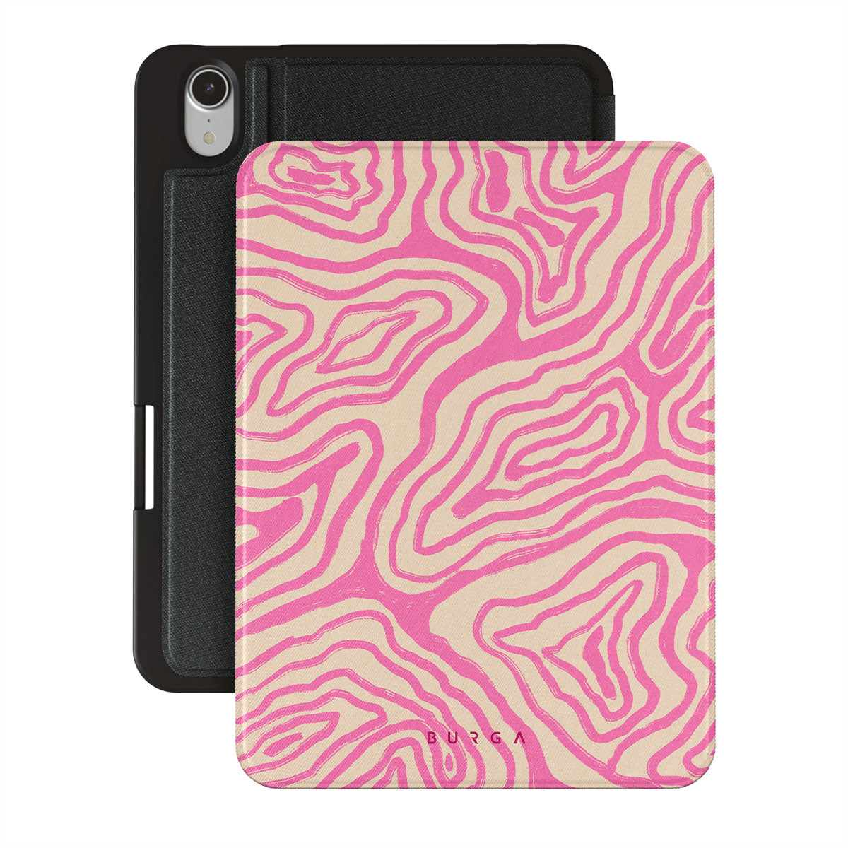 The Pink Shores iPad Mini 8.3 (A17 Pro/6th Gen) 2021 folio case features mesmerizing pink swirls on a cream background. This vibrant, beach-insipired pattern captures the serene beauty of sandy beaches kissed by soft pink waves. Perfect for those who love unique, ocean-inspired aesthetics.