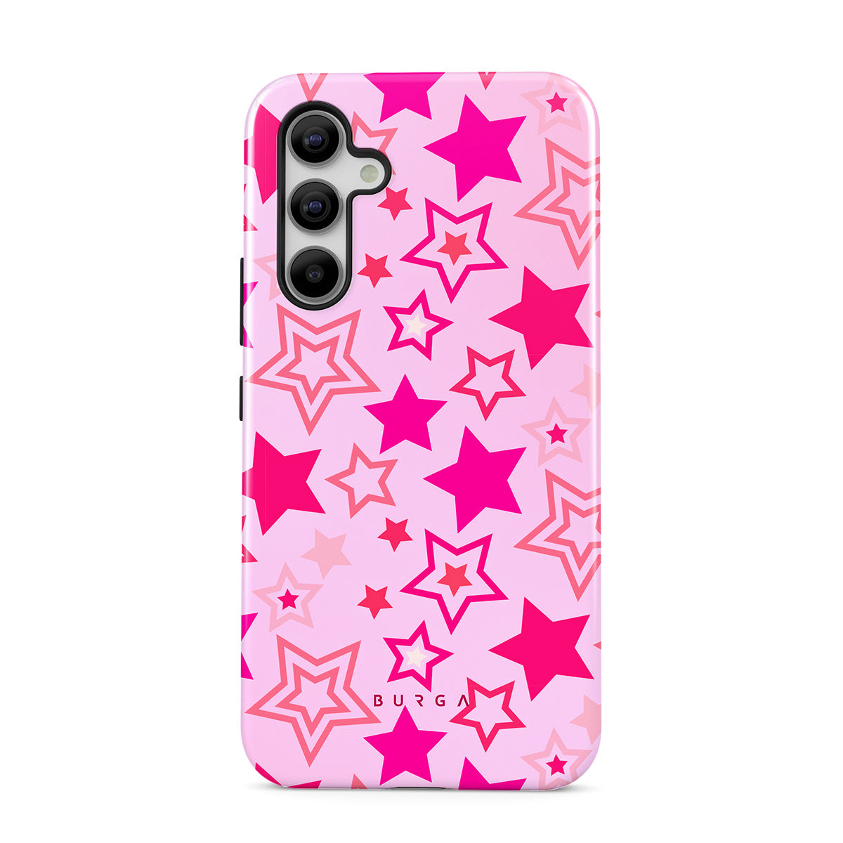 Buckle up for a starry ride, and let's twirl under the Plastic Sky. Neon stars shimmering across a cheeky rose-tinted galaxy create a playful space-disco atmosphere. Be the center of the universe with our Plastic Sky Samsung Galaxy A54 phone case!