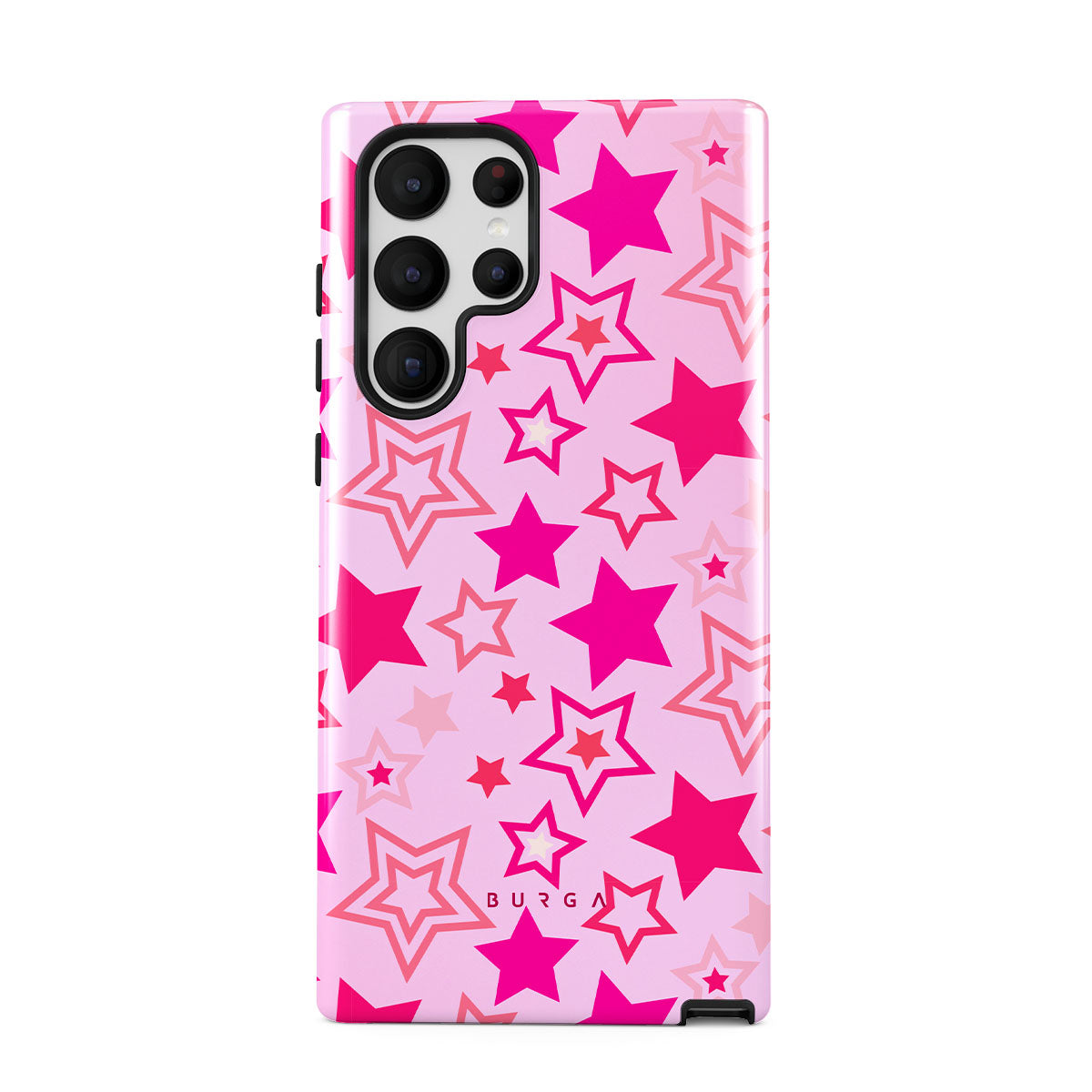 Buckle up for a starry ride, and let's twirl under the Plastic Sky. Neon stars shimmering across a cheeky rose-tinted galaxy create a playful space-disco atmosphere. Be the center of the universe with our Plastic Sky Samsung Galaxy S22 Ultra phone case!
