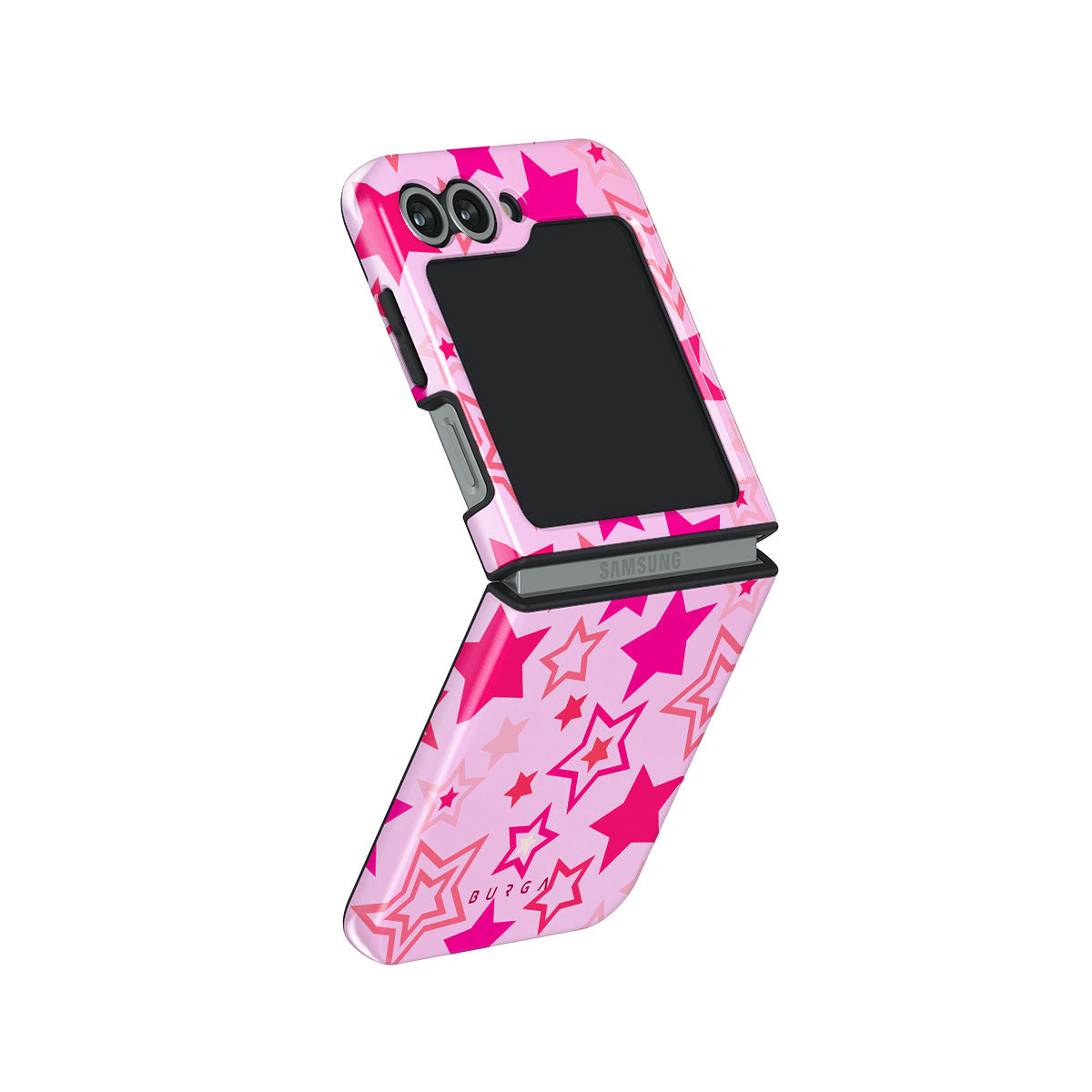Buckle up for a starry ride, and let's twirl under the Plastic Sky. Neon stars shimmering across a cheeky rose-tinted galaxy create a playful space-disco atmosphere. Be the center of the universe with our Plastic Sky Samsung Galaxy Z Flip 6 phone case!