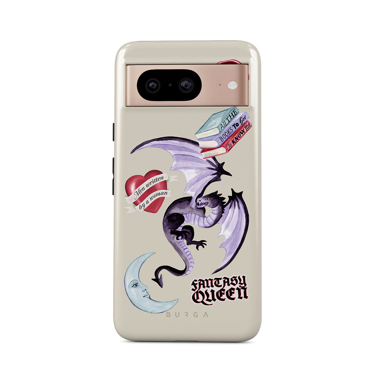 This design features: purple dragon, "Fantasy Queen" sticker, crescent moon, purple wax seal, heart with message, books