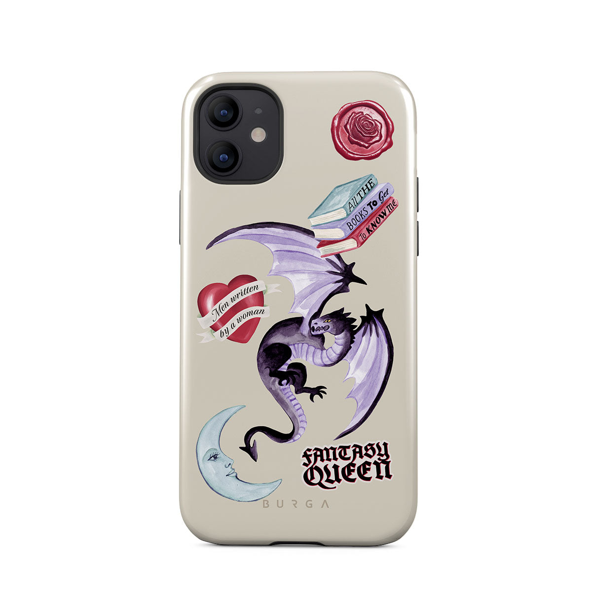 This design features: purple dragon, "Fantasy Queen" sticker, crescent moon, purple wax seal, heart with message, books