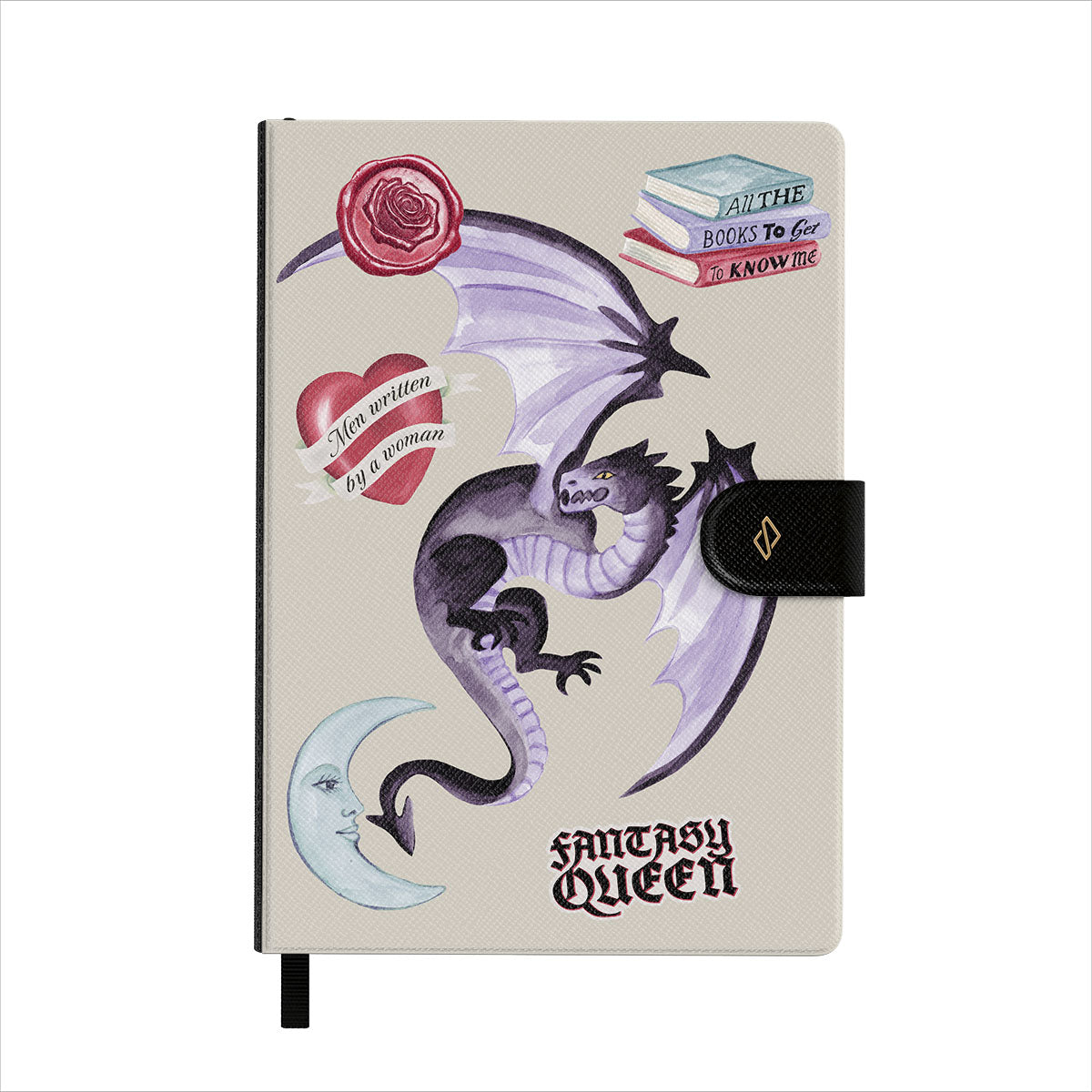 This design features: purple dragon, "Fantasy Queen" sticker, crescent moon, purple wax seal, heart with message, books.