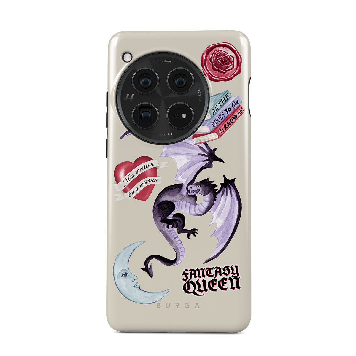 This design features: purple dragon, "Fantasy Queen" sticker, crescent moon, purple wax seal, heart with message, books