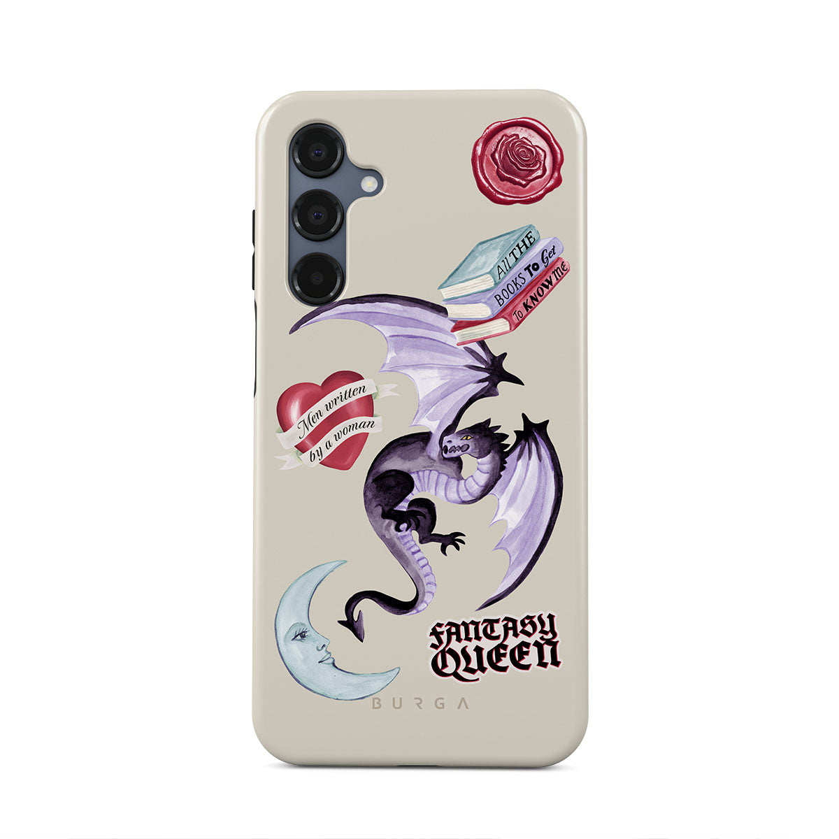 This design features: purple dragon, "Fantasy Queen" sticker, crescent moon, purple wax seal, heart with message, books