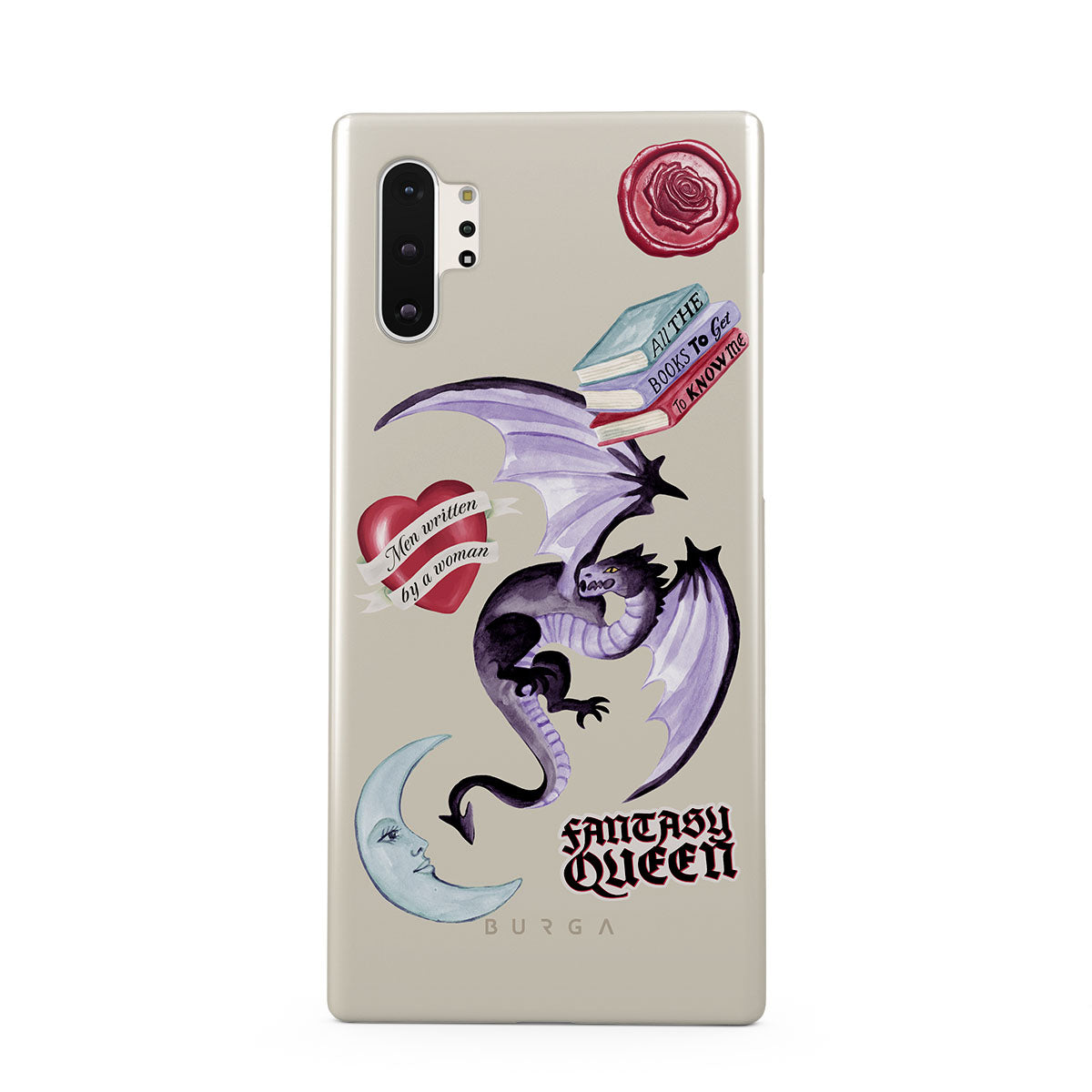 This design features: purple dragon, "Fantasy Queen" sticker, crescent moon, purple wax seal, heart with message, books