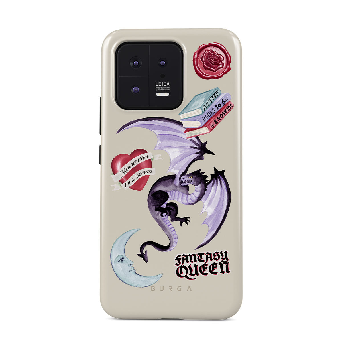 This design features: purple dragon, "Fantasy Queen" sticker, crescent moon, purple wax seal, heart with message, books