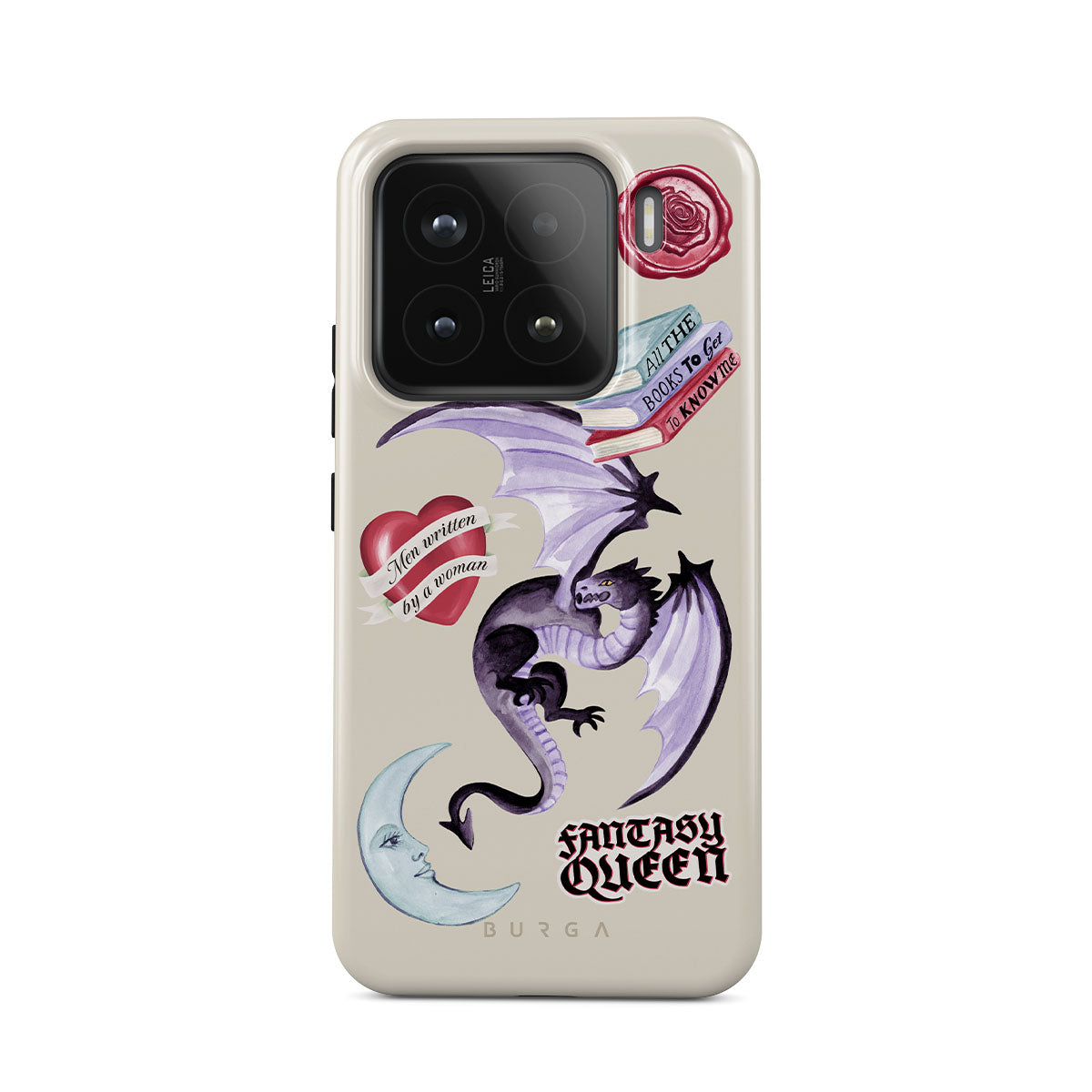 This design features: purple dragon, "Fantasy Queen" sticker, crescent moon, purple wax seal, heart with message, books