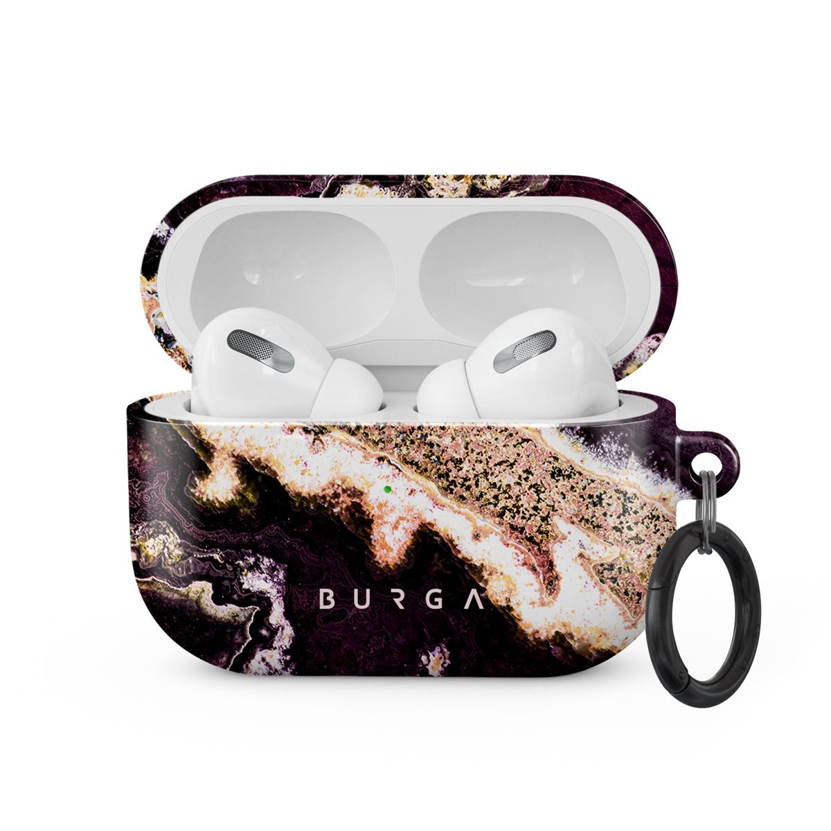 Marble meets geode look in our durable Purple Skies Apple Airpods Pro case cover. You can rest sure that our hard-shell purple marble case cover will protect your device from any unexpected falls while adding elegance and luxury to your style. Our case fits perfectly snug around Apple Airpods Pro . “Like a glove!” one might say. And it won’t disrupt the wireless charging capabilities of the newer model. There’s even an LED light indicator to prove it (don’t worry, wired charging still works, too). When fitted, the BURGA case will protect the delicate Apple Airpods Pro case beneath it from scratches, bumps, and drops while remaining scratch-free itself. Our signature design pattern prints are High Quality, and will never peel or fade away- thanks to our unique printing technology. And finally, a handy carabiner is there to make your life easier and more convenient: just snap it around your keys or belt loop and tackle the day head-on. Your music is right there by your side when you need it.