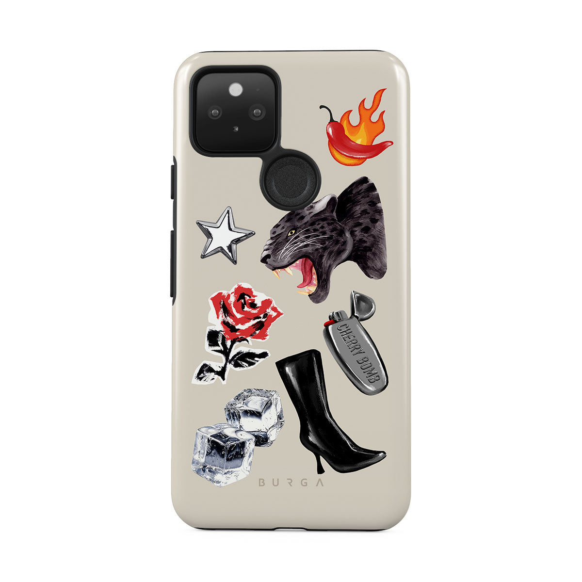 This design features: black panther, red rose, burning bell pepper, silver lighter, black knee-high boots, ice cubes, silver star