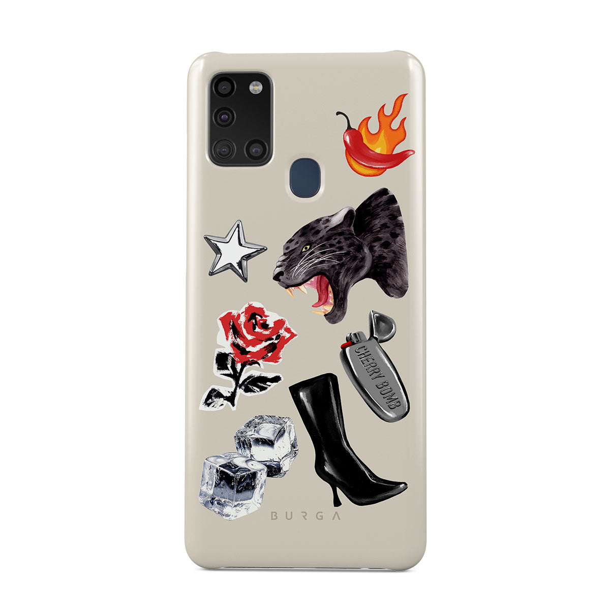 This design features: black panther, red rose, burning bell pepper, silver lighter, black knee-high boots, ice cubes, silver star