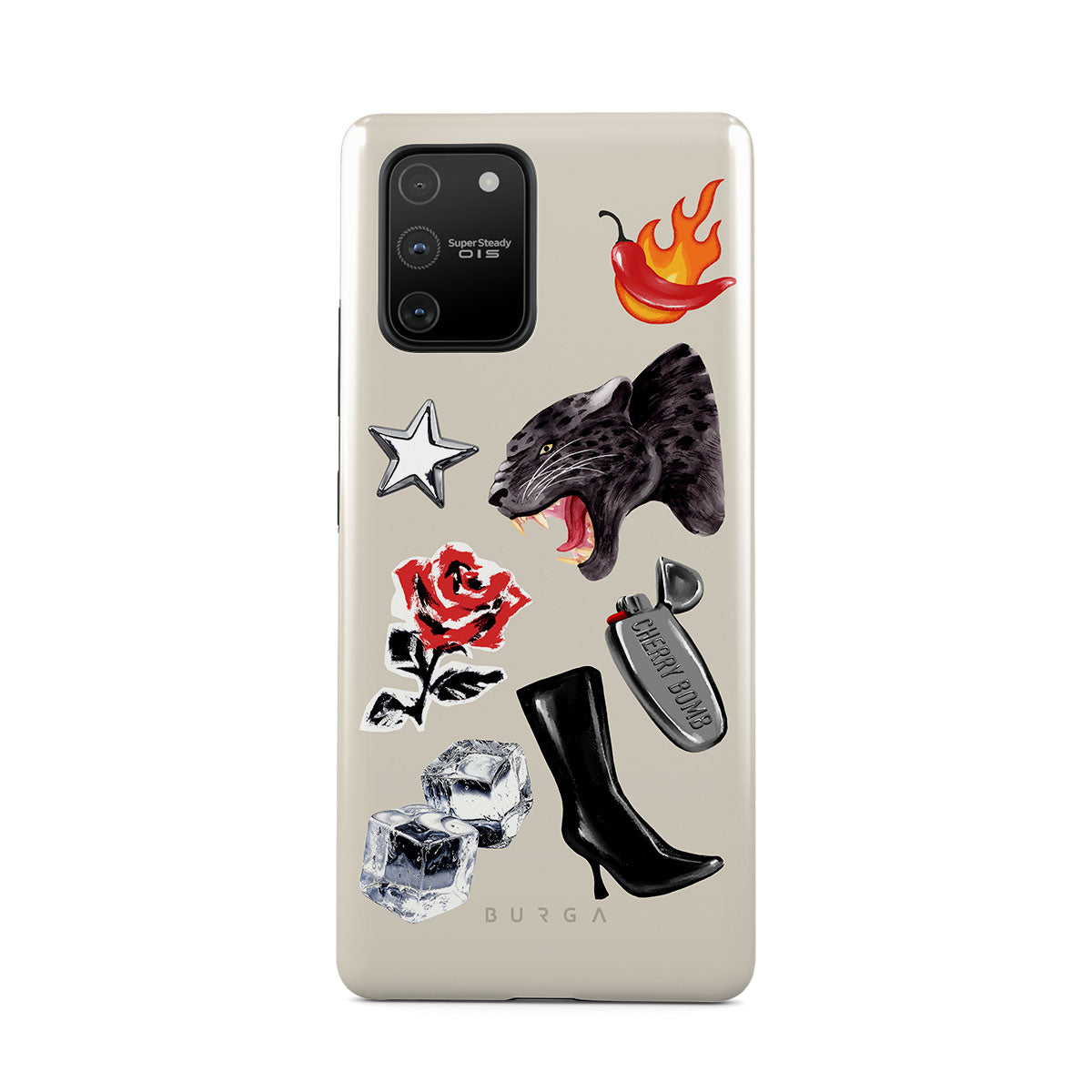 This design features: black panther, red rose, burning bell pepper, silver lighter, black knee-high boots, ice cubes, silver star