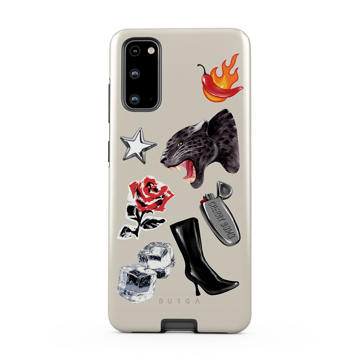 This design features: black panther, red rose, burning bell pepper, silver lighter, black knee-high boots, ice cubes, silver star