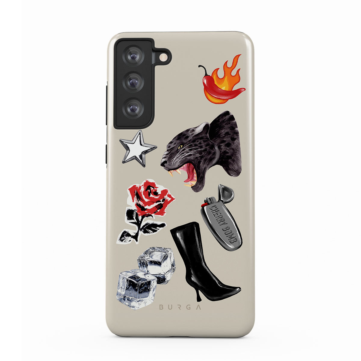 This design features: black panther, red rose, burning bell pepper, silver lighter, black knee-high boots, ice cubes, silver star