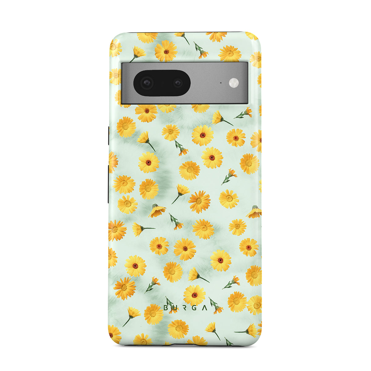 In our Sanctuary of Love Google Pixel 7a phone case, a soft mint marble meets a glowing pattern of yellow flowers that will surely add a splash of energy to your style while protecting your phone from dangerous falls.
