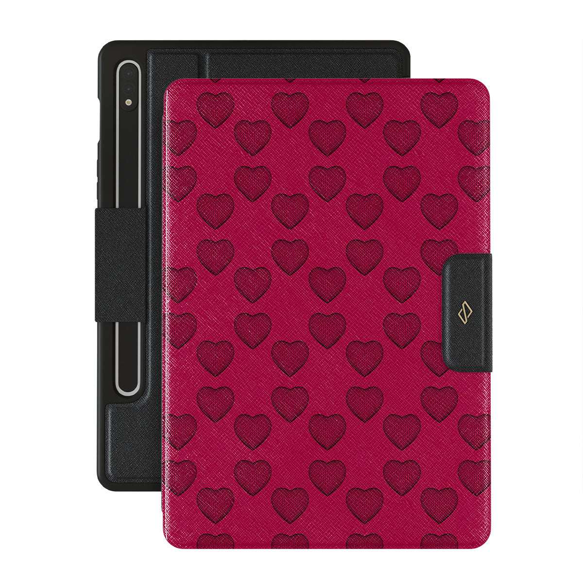 Forget roses. Show the world that you're confident, unapologetically yourself, and ready to take on the day. The vivid pink background is eye-catching and fun. The floating darker hearts add depth and sophistication. While serving as a gentle reminder to prioritize your own happiness, our Single Not Sorry Samsung Galaxy Tab S8+/S7+/S7 FE folio case will brighten up any outfit.