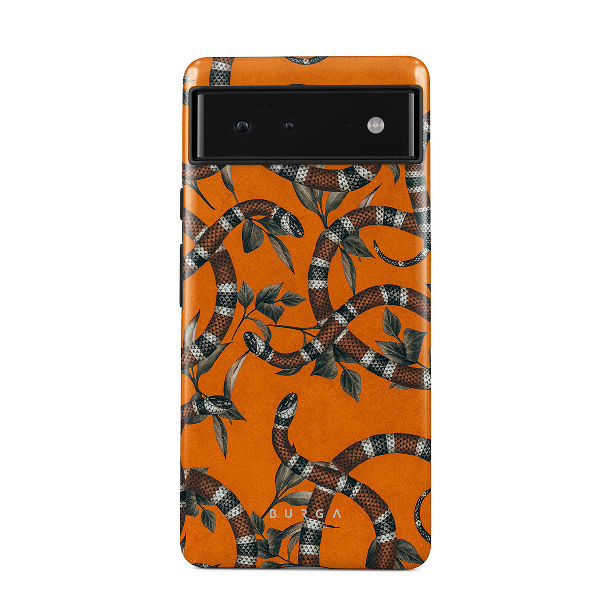 Take a bit of fierceness with yourself with our bright orange and dangerously beautiful Google Pixel 6a phone case with a snake pattern. This case is real eye candy for fashion lovers and just as needed for those who strive to keep their phones protected.
