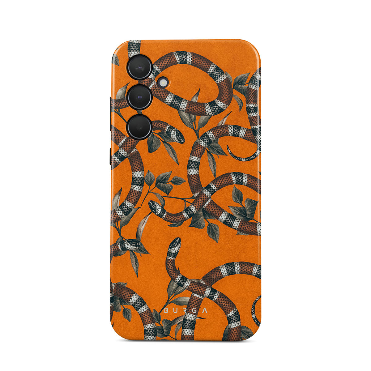 Take a bit of fierceness with yourself with our bright orange and dangerously beautiful Samsung Galaxy A51 phone case with a snake pattern. This case is real eye candy for fashion lovers and just as needed for those who strive to keep their phones protected.