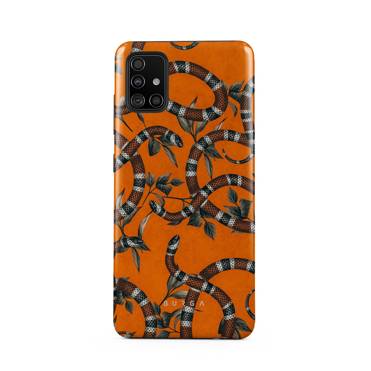 Take a bit of fierceness with yourself with our bright orange and dangerously beautiful Samsung Galaxy A51 phone case with a snake pattern. This case is real eye candy for fashion lovers and just as needed for those who strive to keep their phones protected.