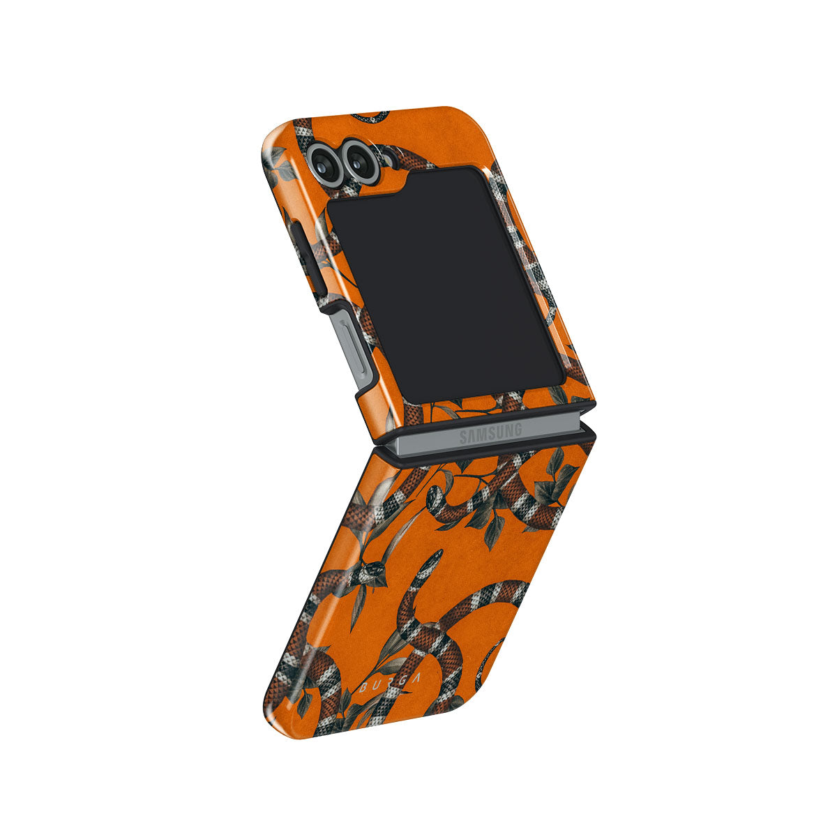 Take a bit of fierceness with yourself with our bright orange and dangerously beautiful Samsung Galaxy Z Flip 6 phone case with a snake pattern. This case is real eye candy for fashion lovers and just as needed for those who strive to keep their phones protected.