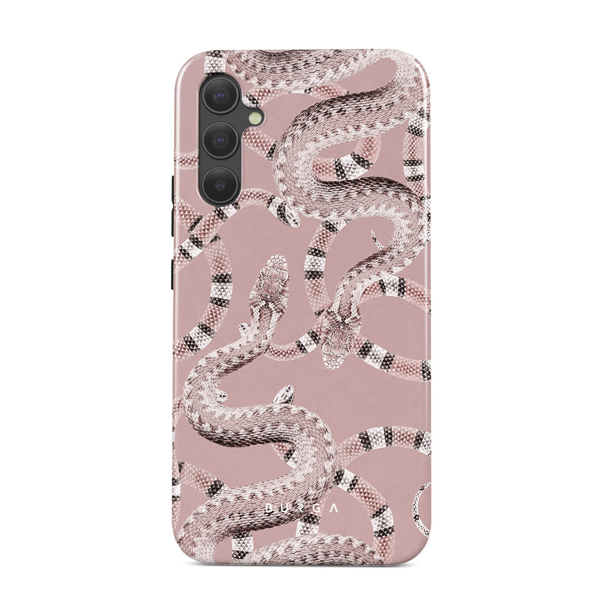 Bring the fierceness with our Poolside Glam Samsung Galaxy A34 phone case. With the pastel pink case featuring snakes, let everyone know that you can always stand for yourself no matter your kind nature. Make a statement and protect your phone at the same time.