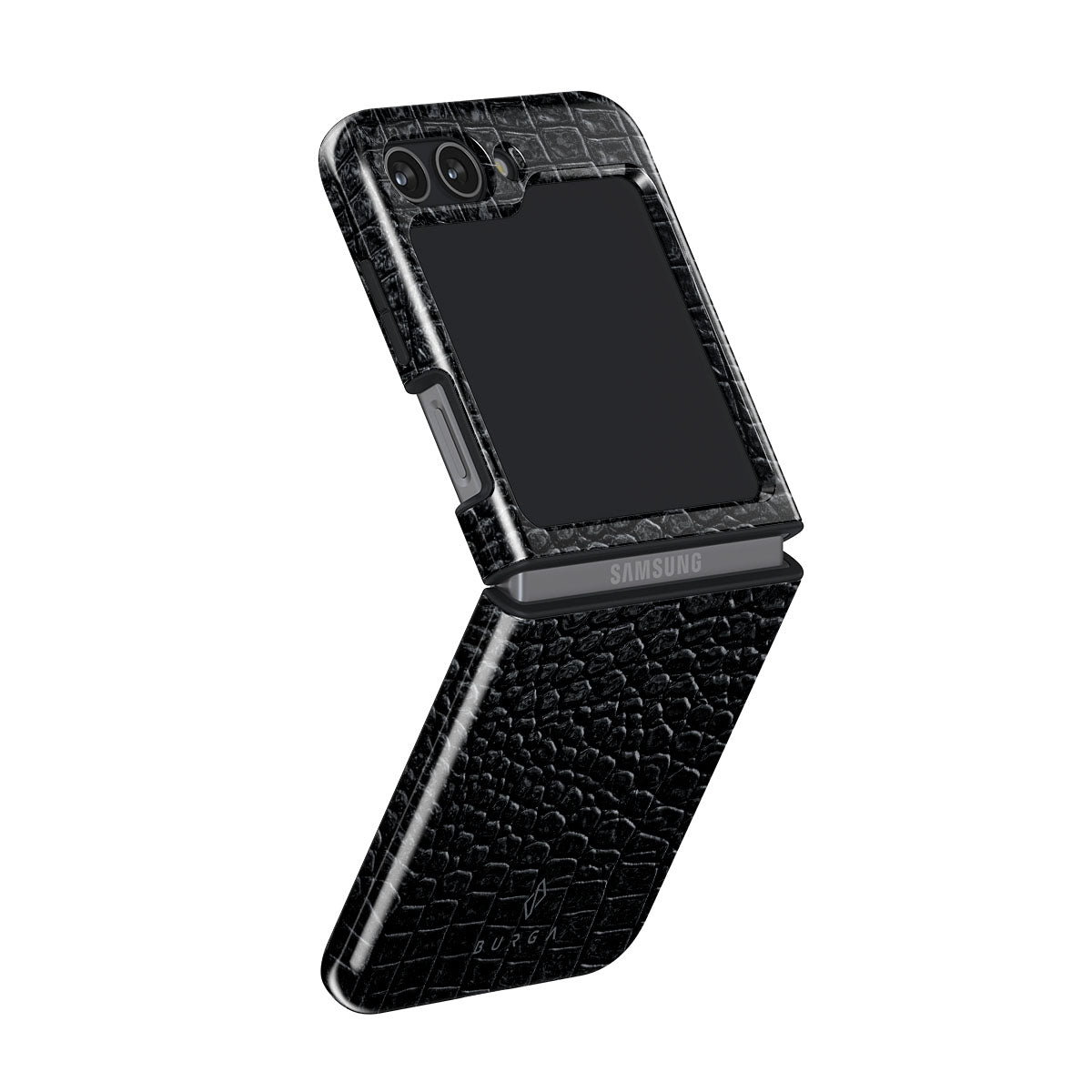 Our Reaper's Touch Samsung Galaxy Z Flip 5 phone case cover features a classic snakeskin design in dark black. The dangerous animal print will add confidence and a touch of luxury to your style while transforming your phone into a fashion accessory.