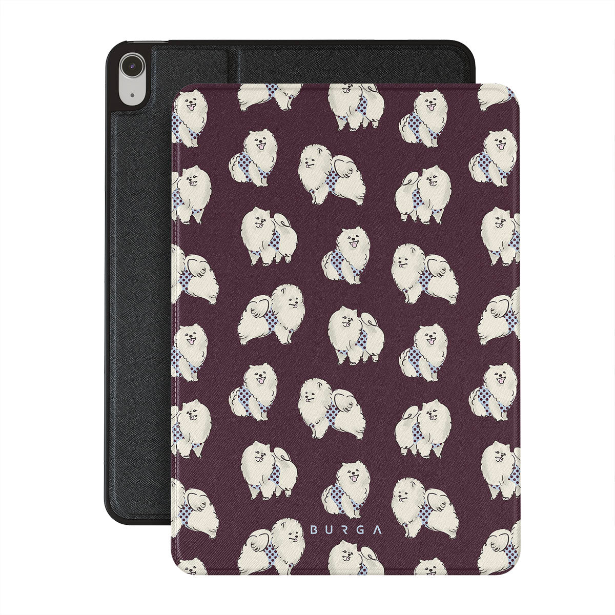 This design features: white fluffy dogs on a deep burgundy background, poodles, pets.