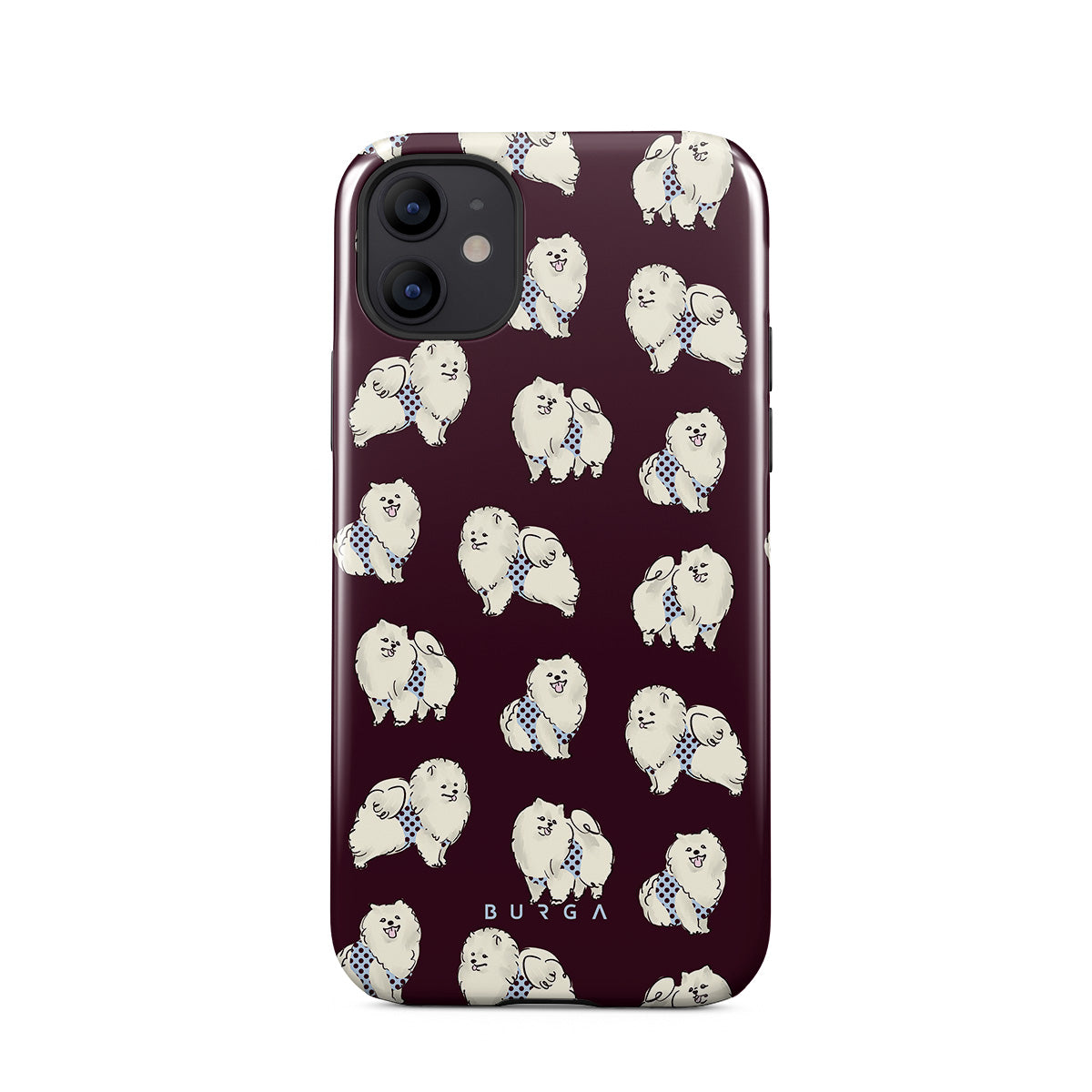 This design features: white fluffy dogs on a deep burgundy background, poodles, pets.